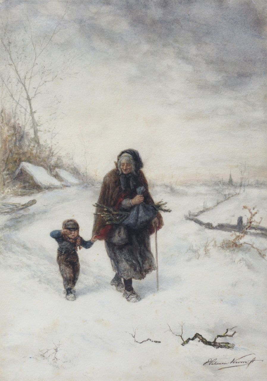 Elchanon Verveer kunstwerk • aquarel • tekening • voorheen te koop Hout sprokkelen in de sneeuw