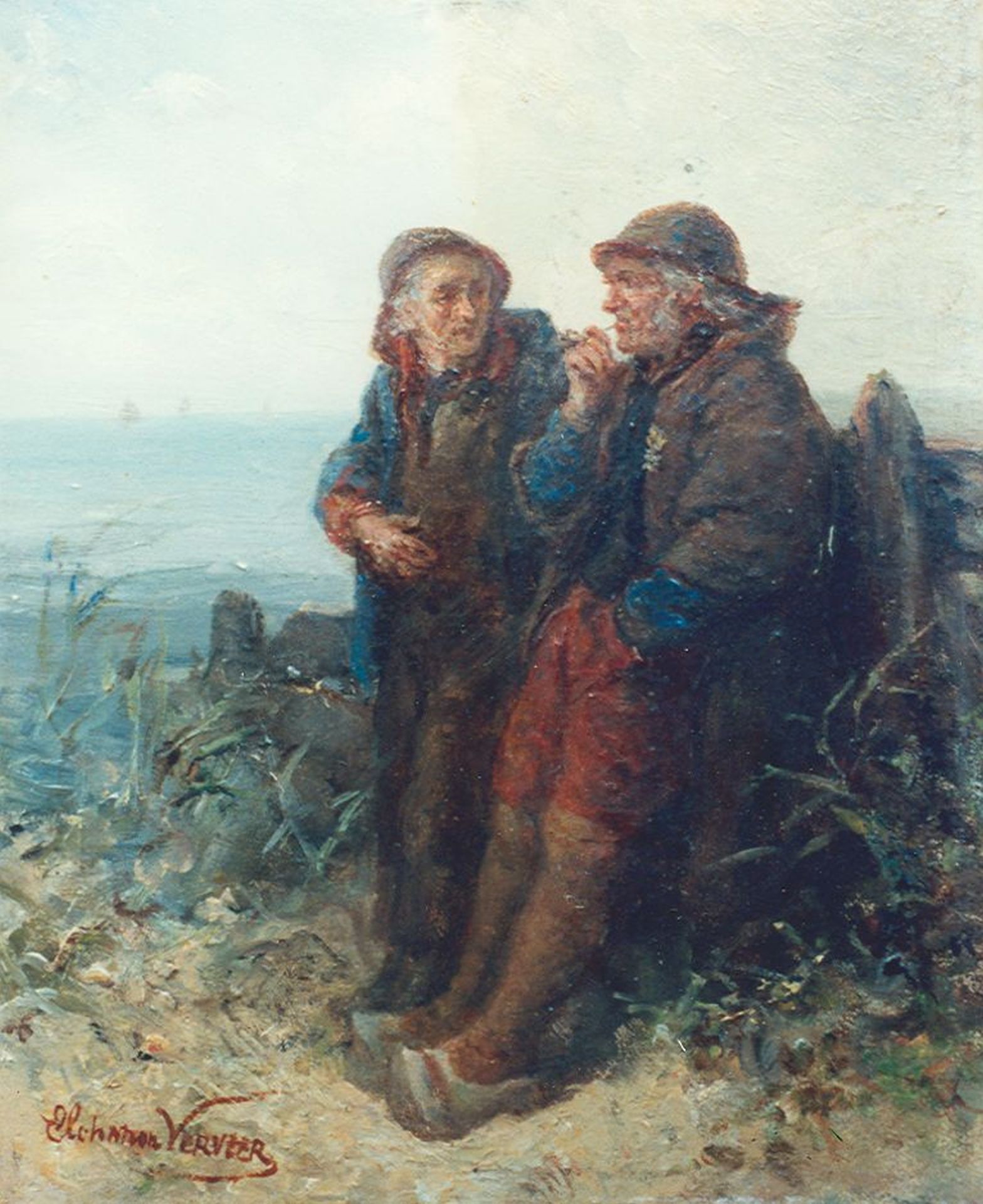 Elchanon Verveer woonde en werkte in Den Haag, waar hij zijn artistieke loopbaan begon als houtgraveur. In 1845 besloot hij echter schilderslessen te gaan volgen aan de Haagse academie, waar hij les kreeg van onder andere zijn broer Samuel en H.F.C. ten Cate. Verveer schilderde vooral genrestukken die betrekking hadden op het harde vissersbestaan, een bij uitstek 19e-eeuws thema. Aanvankelijk schilderden kunstenaars ‘onschuldige’ taferelen als bedrijvige vissersvrouwen, interieurscènes, en de vloot op zee of op het strand. Later ontstonden ook beladen voorstellingen, zoals de wachtende vissersvrouw, onzeker over het lot van haar man.