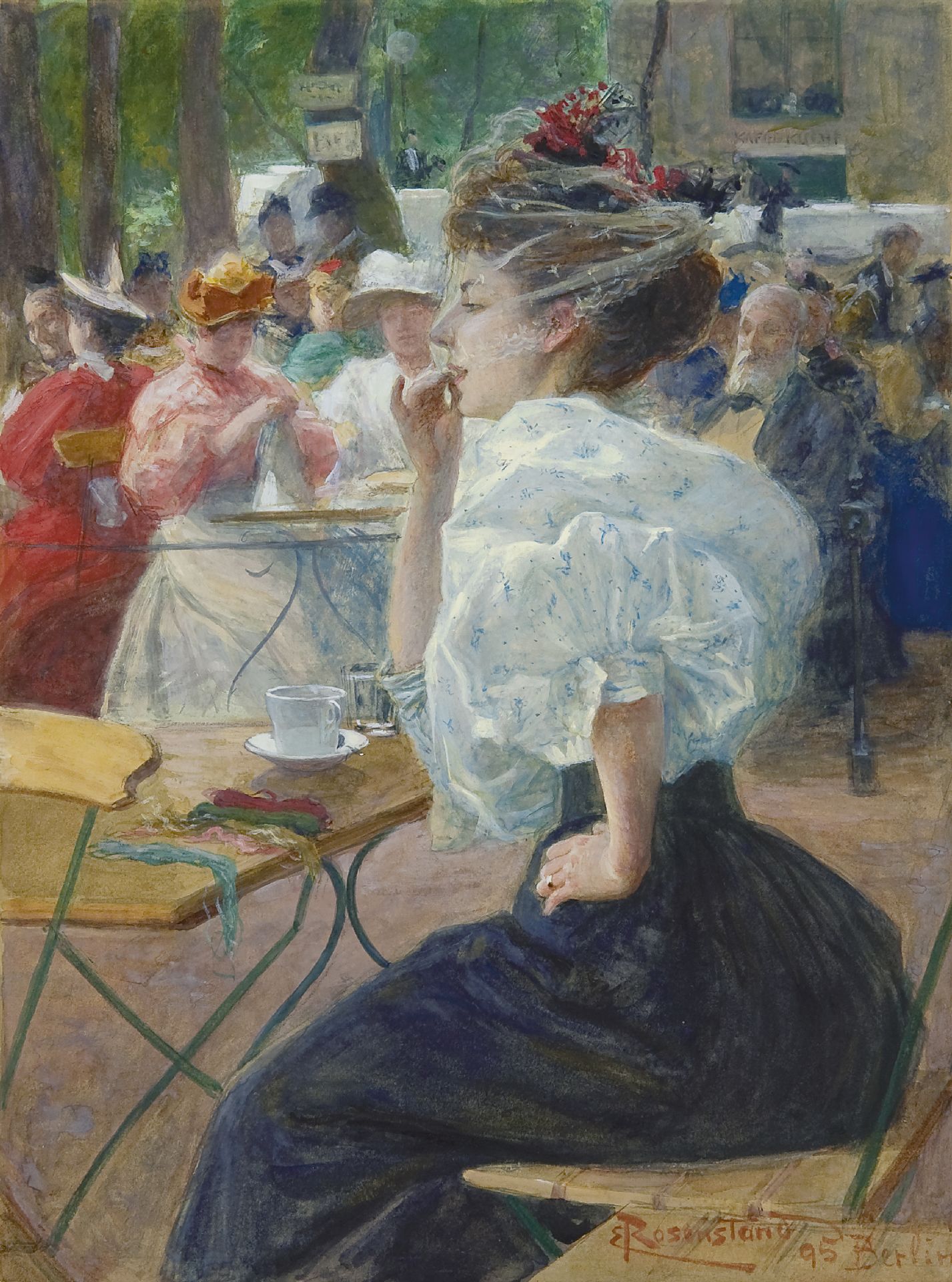 Een jonge elegante vrouw op een terras is het onderwerp van deze verfijnde gouache. Om haar heen is het druk, maar zij lijkt alleen in haar wereld. Of toch niet? Doordat de schilder positie dichtbij haar neemt worden wij als het ware haar wereld in getrokken. Het schilderij is een voorbeeld van het geïdealiseerde vrouwenportret dat rond 1870 in Europa grote mode werd. Emil Rosenstand werd geboren op Jutland en kreeg zijn opleiding aan de academie van Kopenhagen. In 1887 trok hij voorgoed naar Berlijn, waar hij naam maakte als schilder van het moderne stadsleven rond de eeuwwisseling.