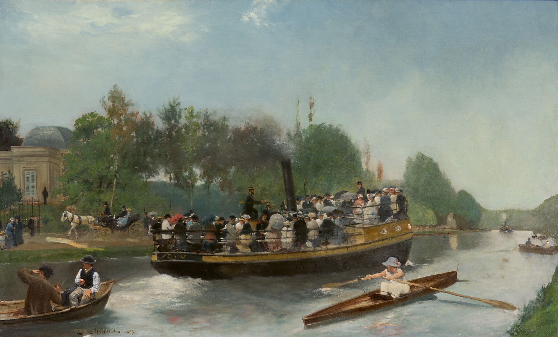 De Belgische schilder Emile Hoeterickx werd opgeleid aan de academie van Brussel. Zijn oeuvre omvat marines, landschappen, stadsgezichten, genretaferelen en een combinatie daarvan. Afgebeeld is hier de Willebroeksevaart, die vroeger langs de tuin en het kasteel Laken (Brussel) en het domein 'Drie Fonteinen' liep, een kasteel, park en dorpje dat heden ten dage in Vilvoorde ligt. Klaarblijkelijk vond er veel pleziervaart op dit water plaats en het was in de 19e eeuw een geliefd uitje voor de inwoners van Brussel.