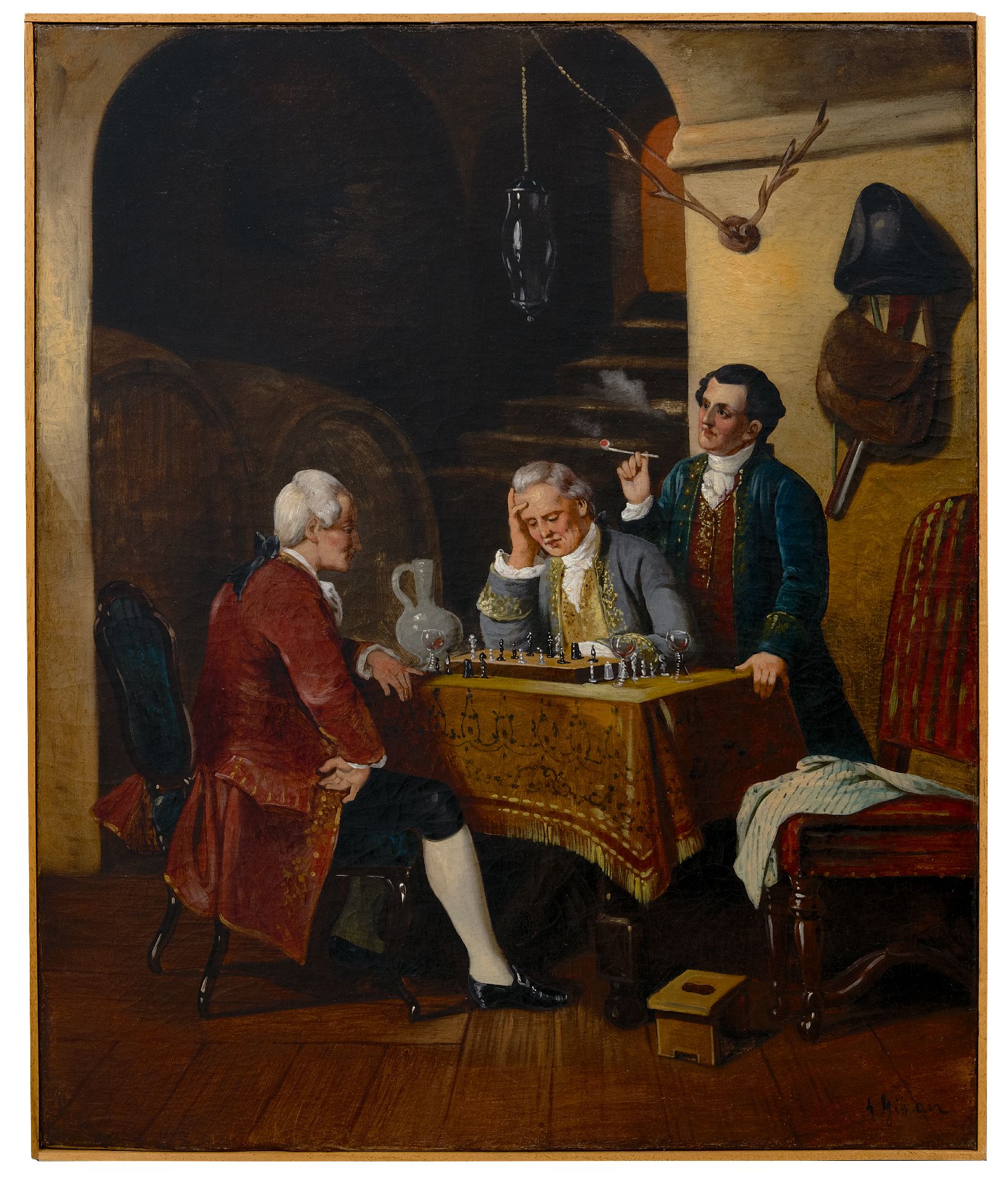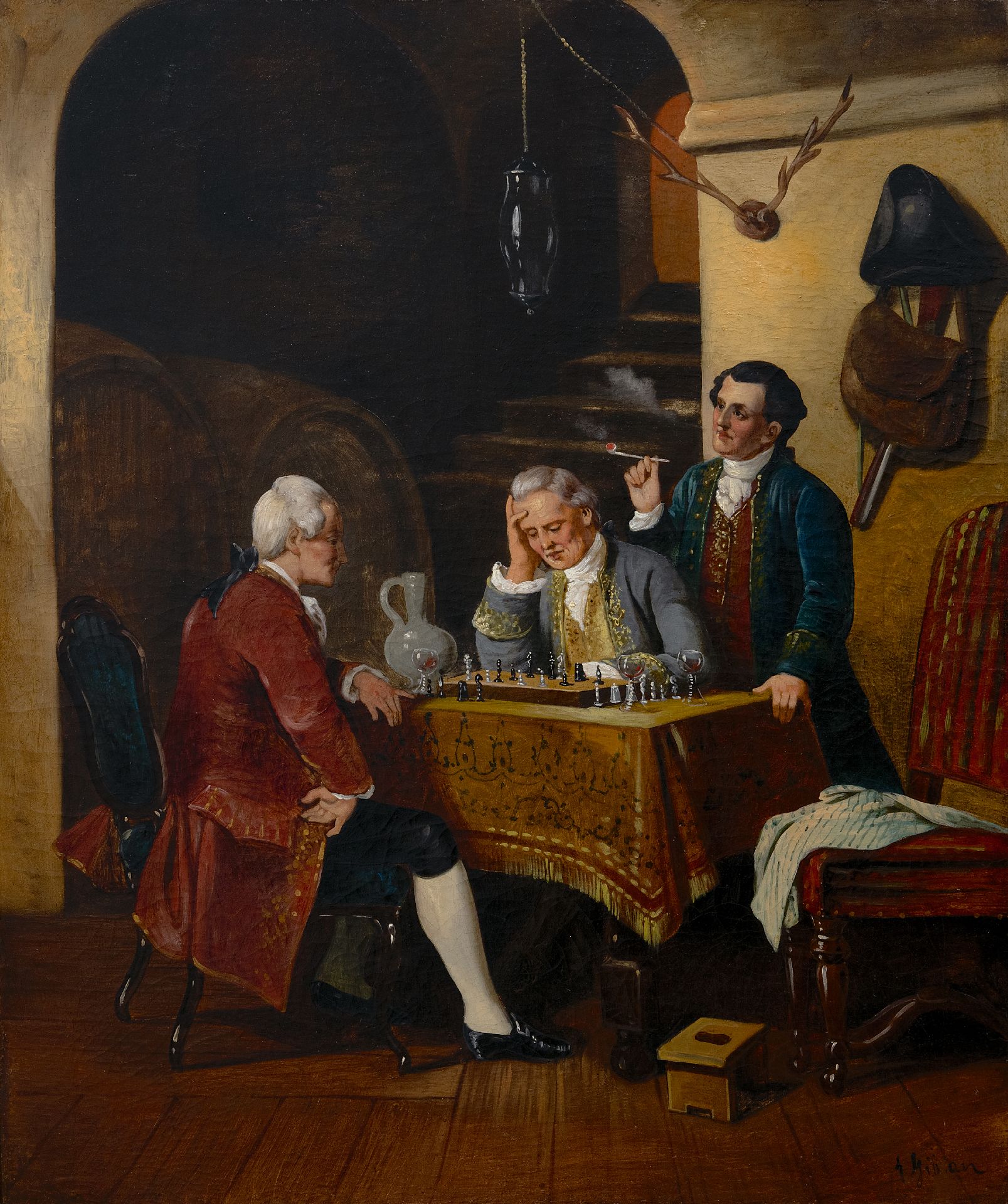 Engelse School kunstwerk • schilderij • te koop Schaakspelers in een wijnkelder