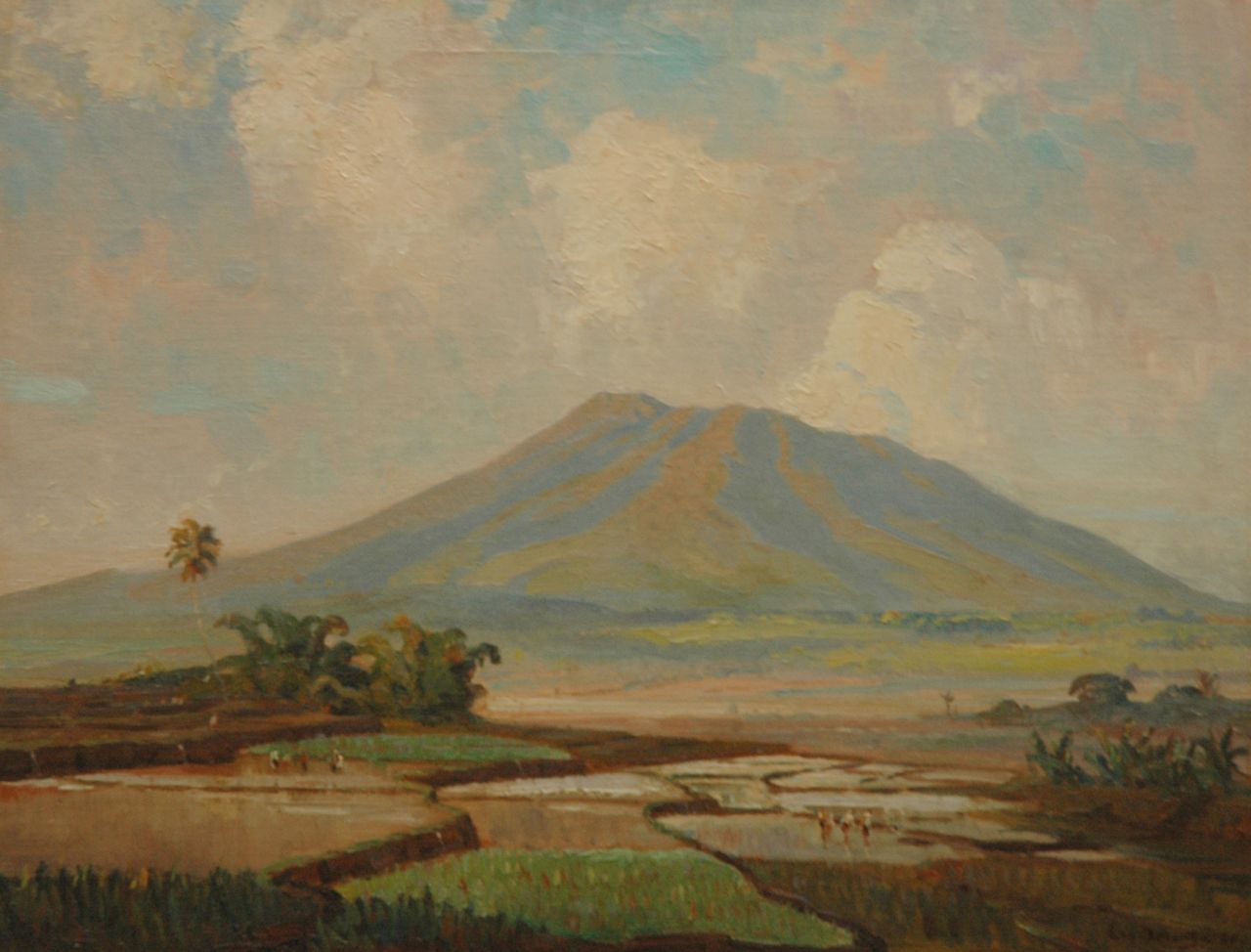 Ernest Dezentjé kunstwerk • schilderij • voorheen te koop Arbeiders in de rijstvelden aan de voet van een vulkaan