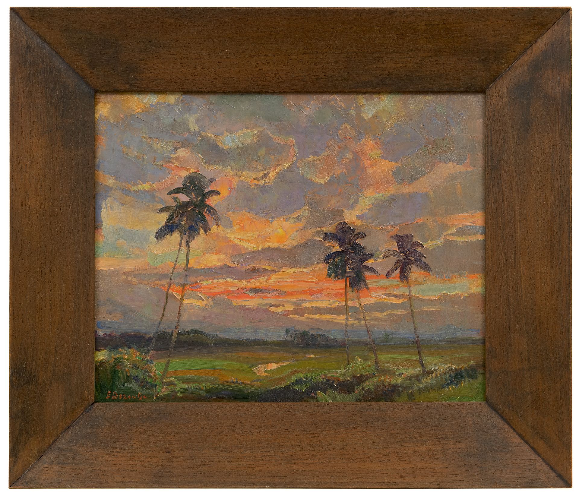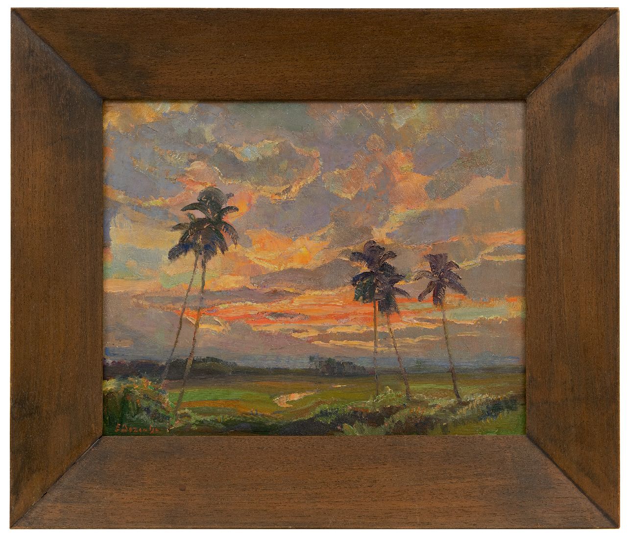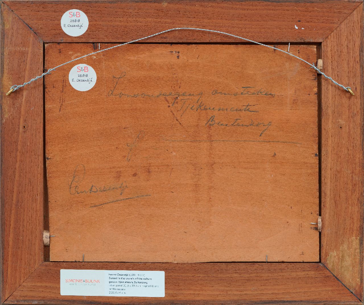 Ernest Dezentjé kunstwerk • schilderij • voorheen te koop Zonsondergang in de omgeving van de kultuurtuin Tjikeumeuh, Buitenzorg