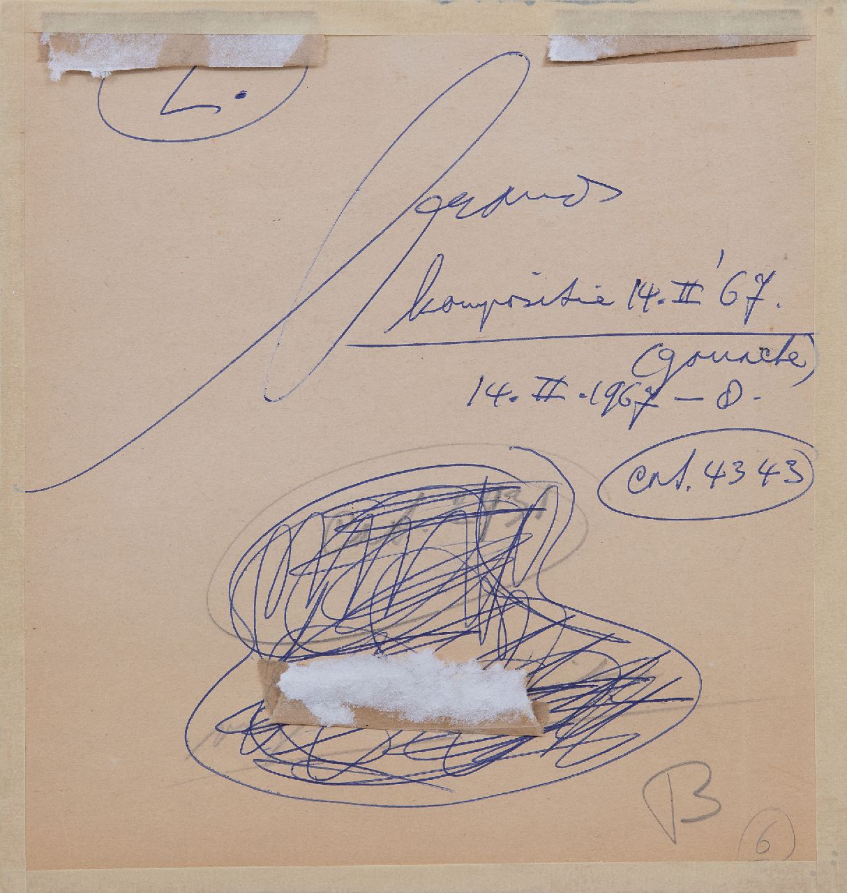 annotatie op spieraam: 'Brands kompositie 14.II '67 (gouache) 14.II.1967-8. (cat. 4343)'