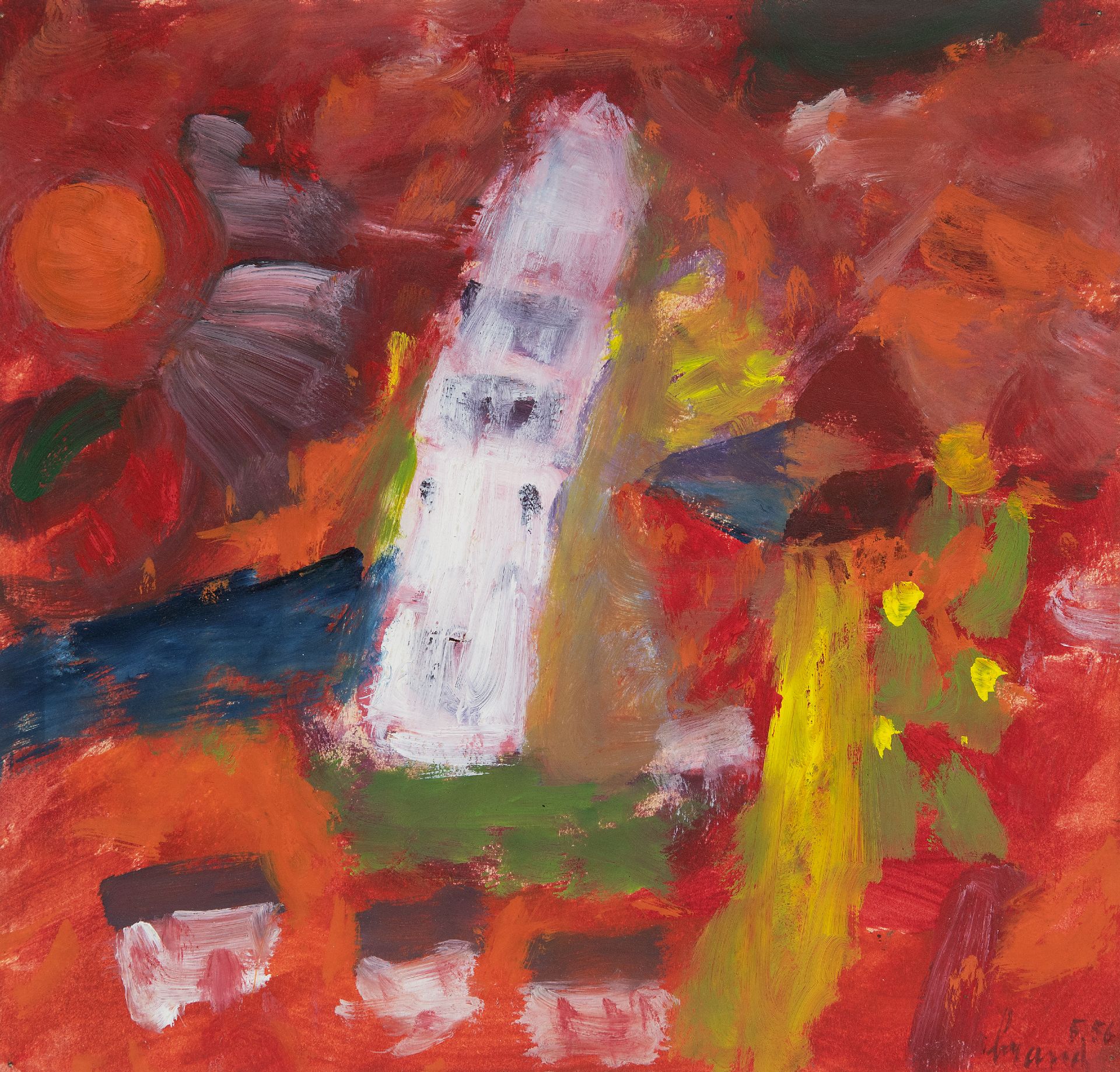 annotatie verso (tweemaal): 'toren in landschap, mei '56 Brands'