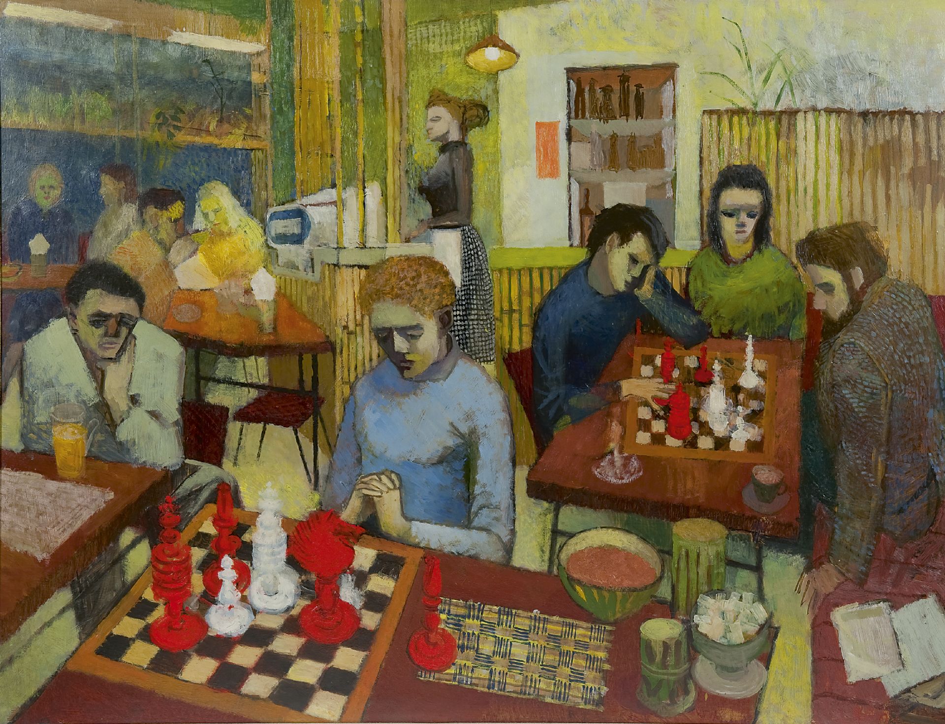 Europese School, 20e eeuw   | Europese School, 20e eeuw | Schilderijen te koop aangeboden | Schaakspelers in het café, olieverf op schildersboard 68,4 x 91,6 cm, gesigneerd rechtsonder met initialen 'R.S.' en gedateerd 1956, zonder lijst