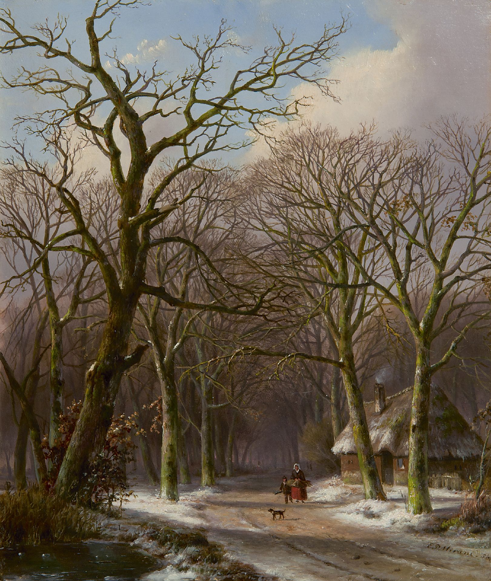 Everardus Mirani kunstwerk • schilderij • voorheen te koop Landvolk op een besneeuwd bospad
