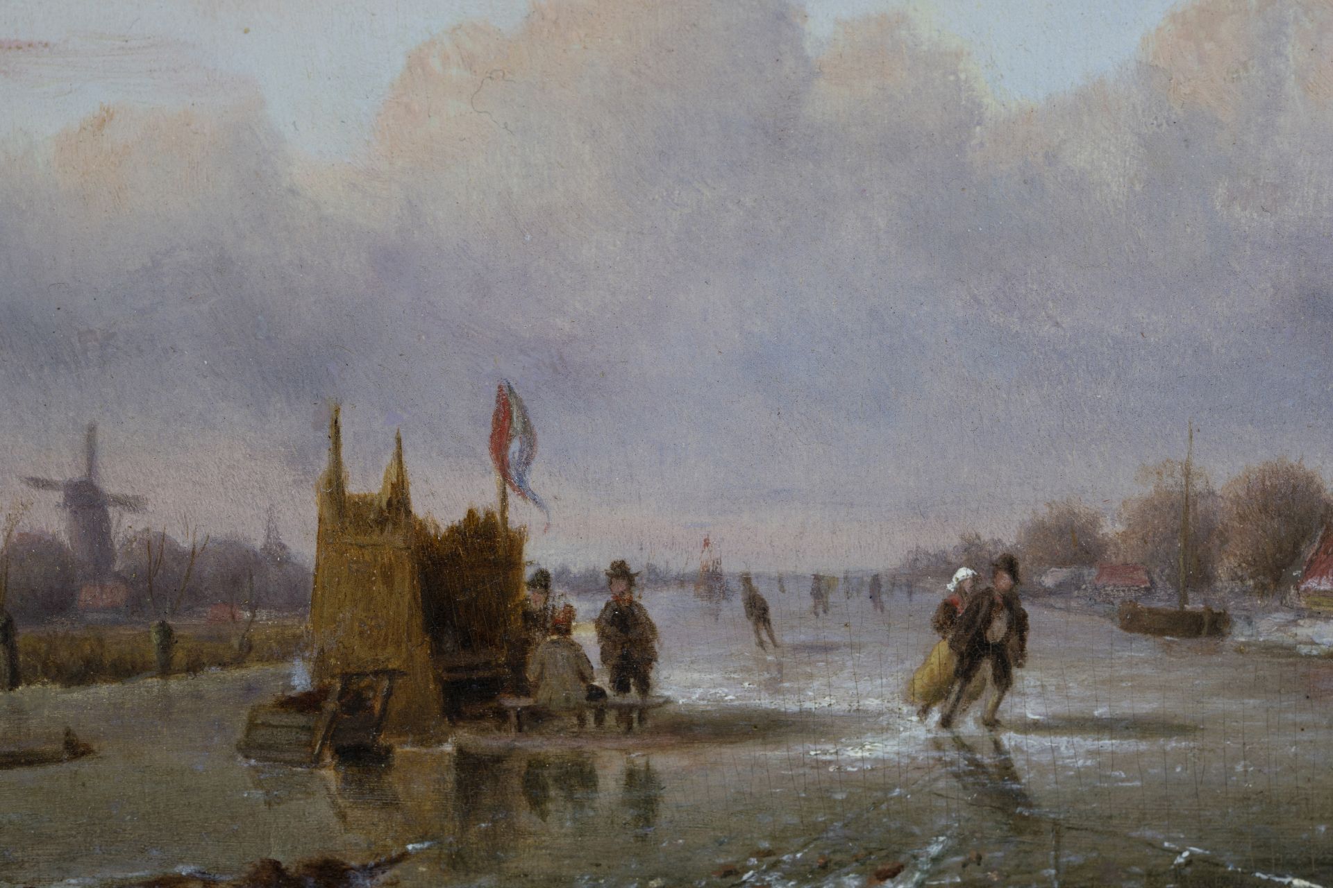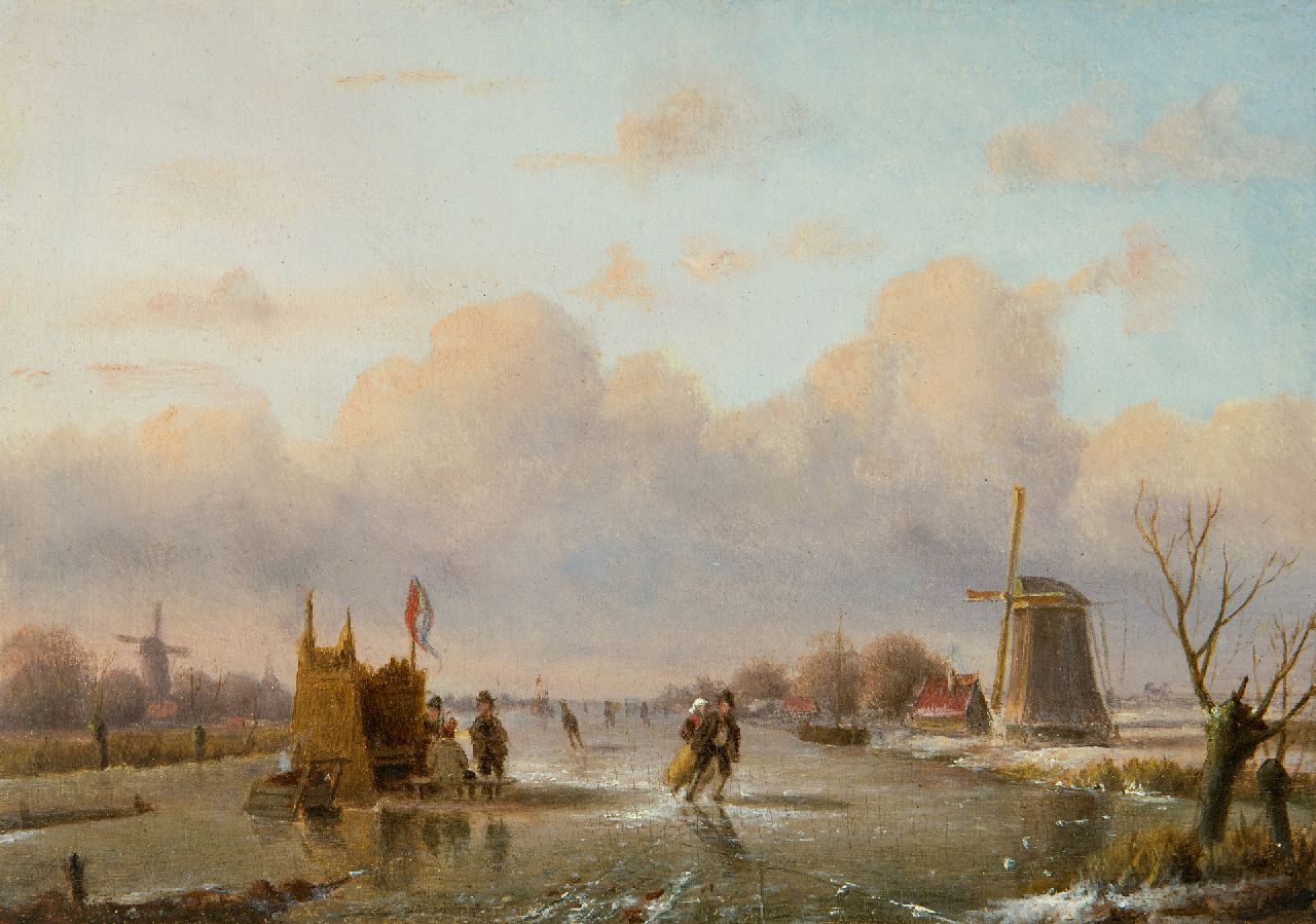 Everardus Mirani kunstwerk • schilderij • te koop Winterlandschap met schaatsers en volk bij een koek-en-zopietent (alleen tezamen met 22135-zomer)