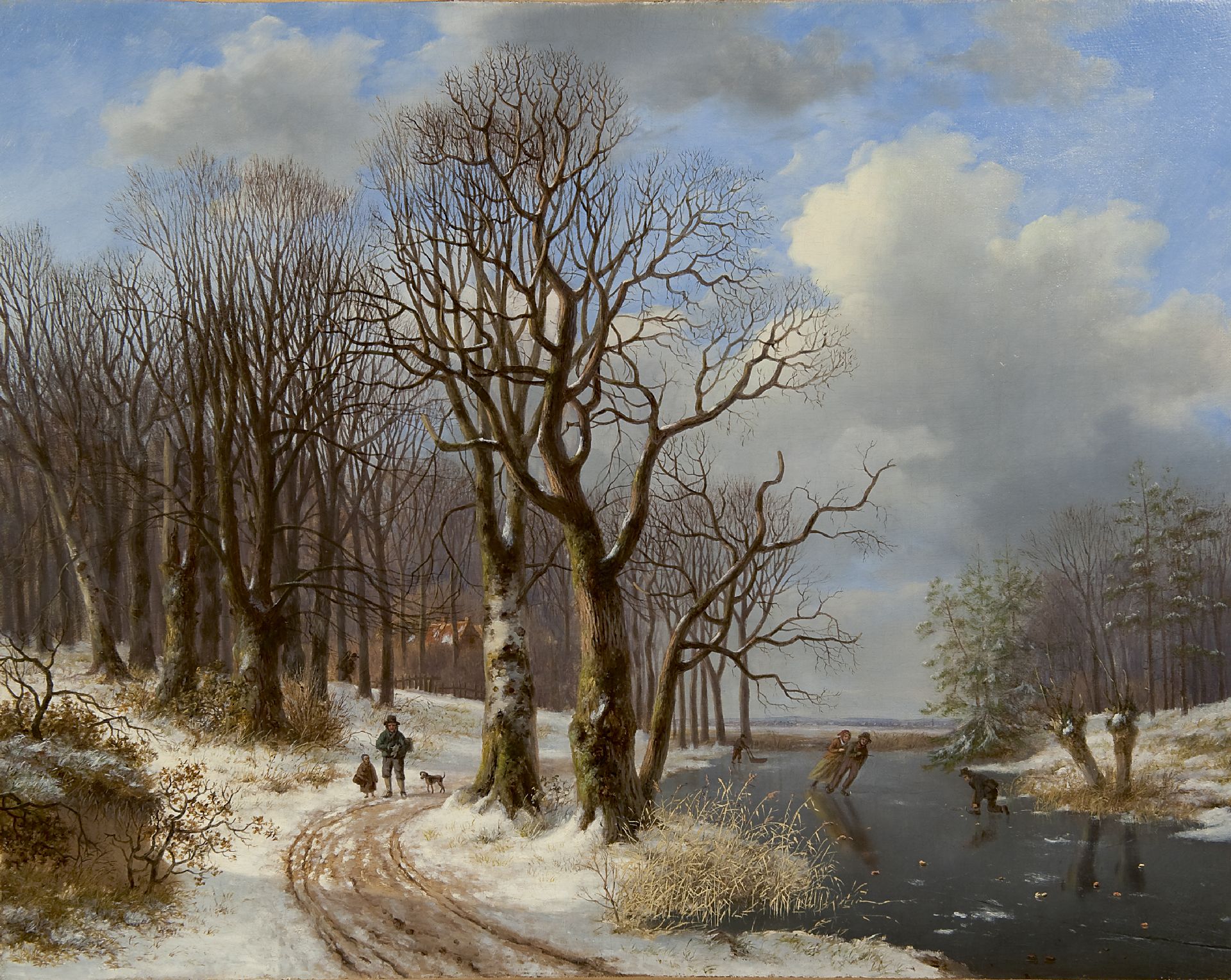 Everardus Mirani kunstwerk • schilderij • voorheen te koop Winterlandschap met schaatsers en wandelaars