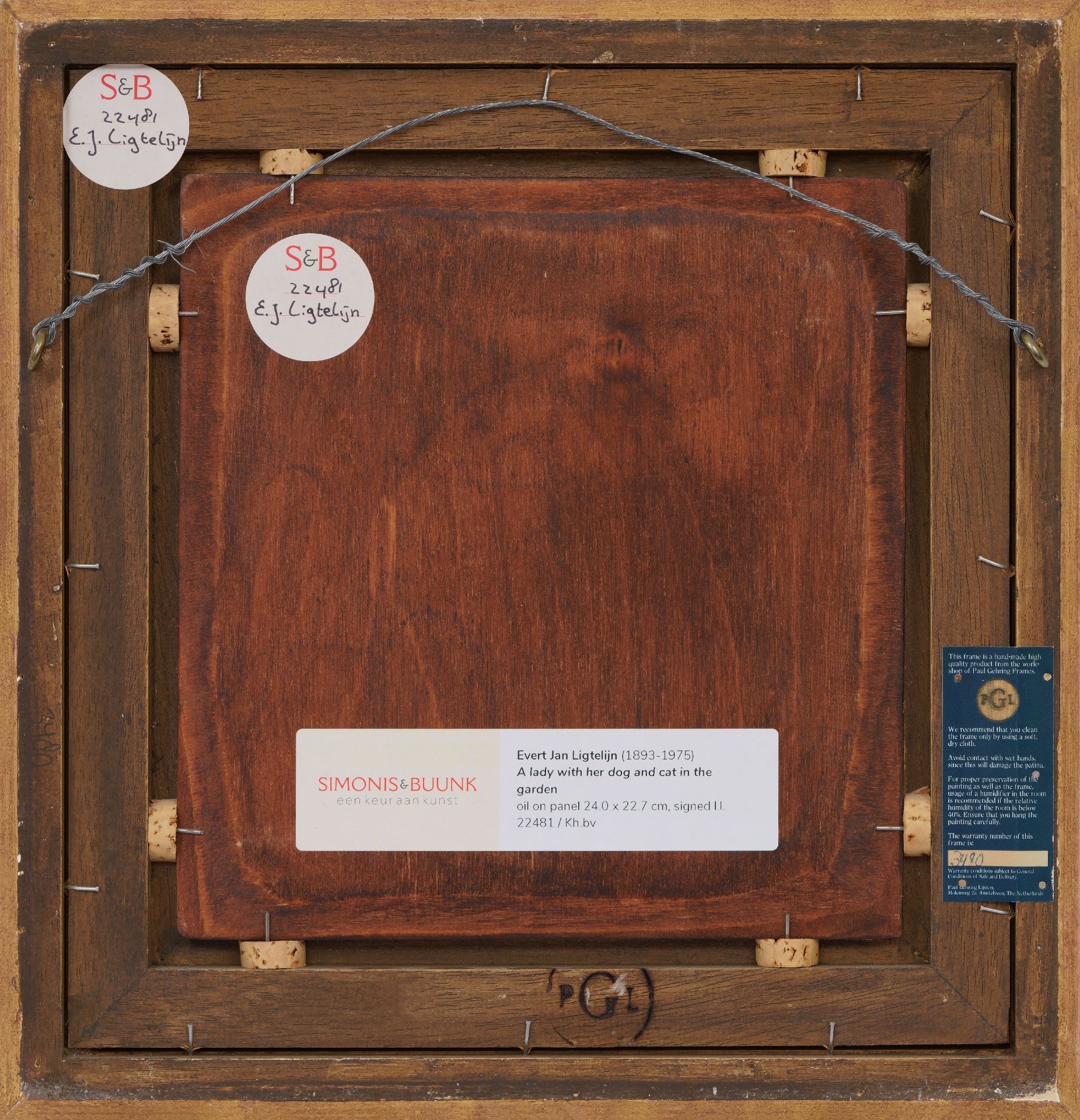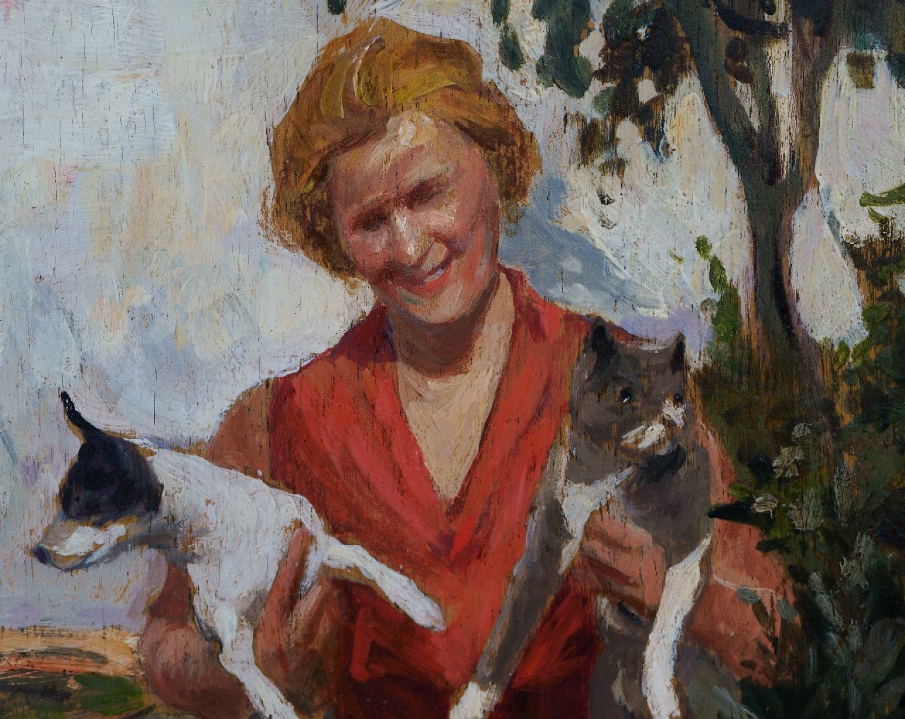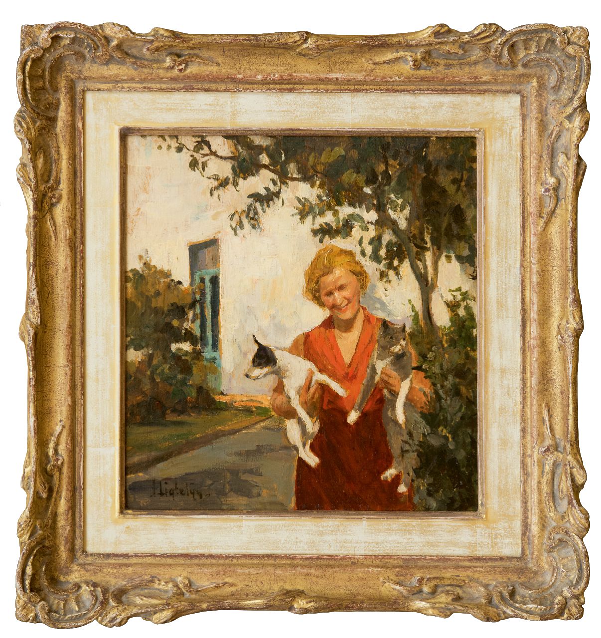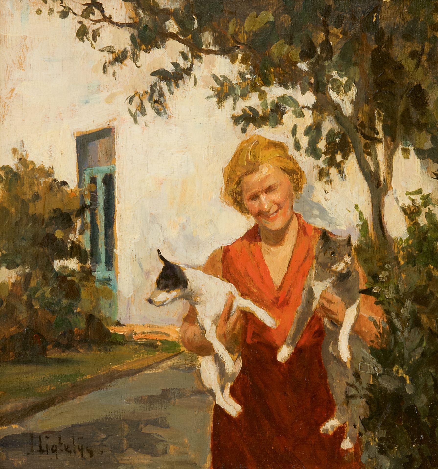 Evert Jan Ligtelijn kunstwerk • schilderij • voorheen te koop Vrouw met hond en kat in de tuin