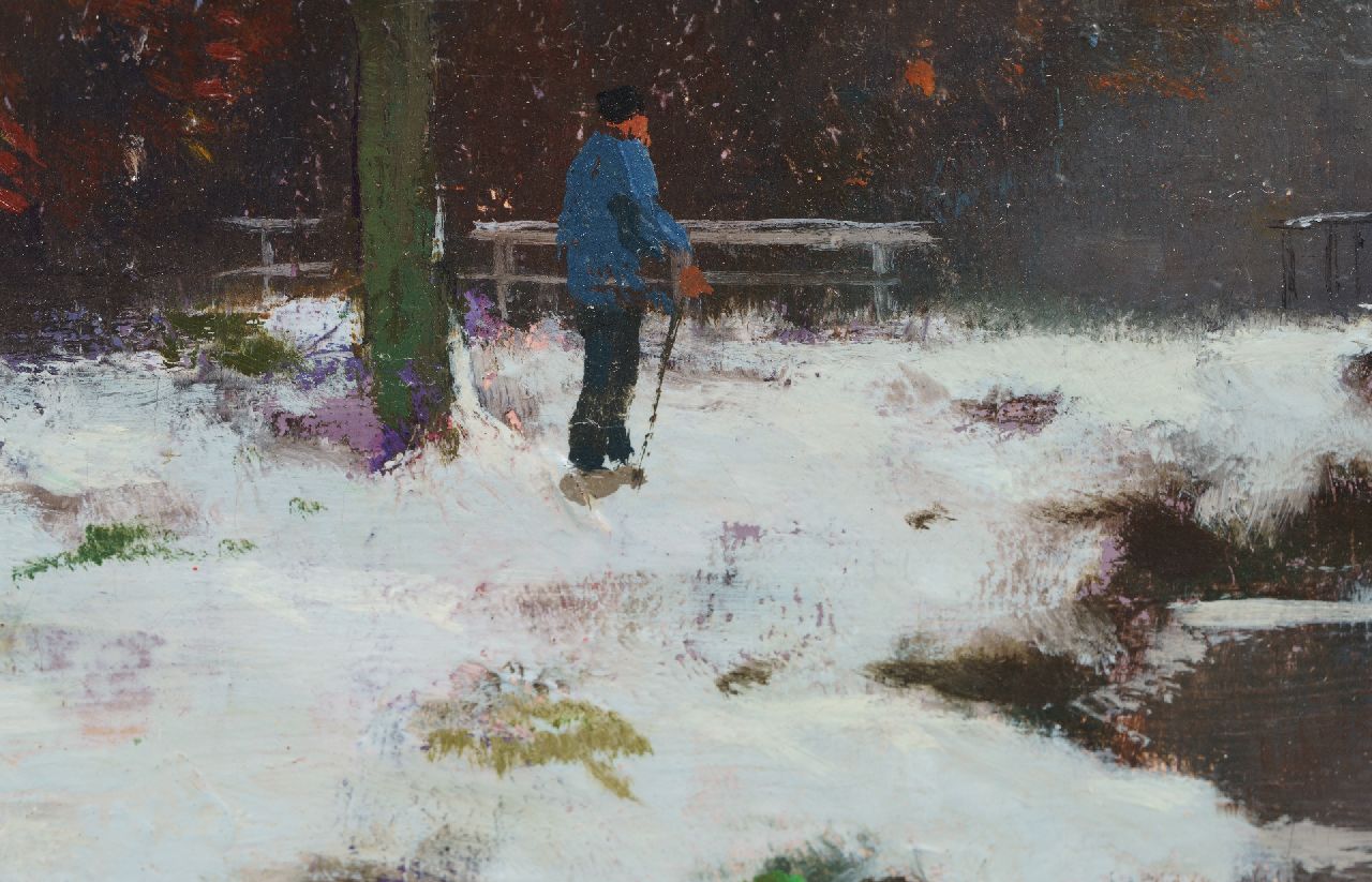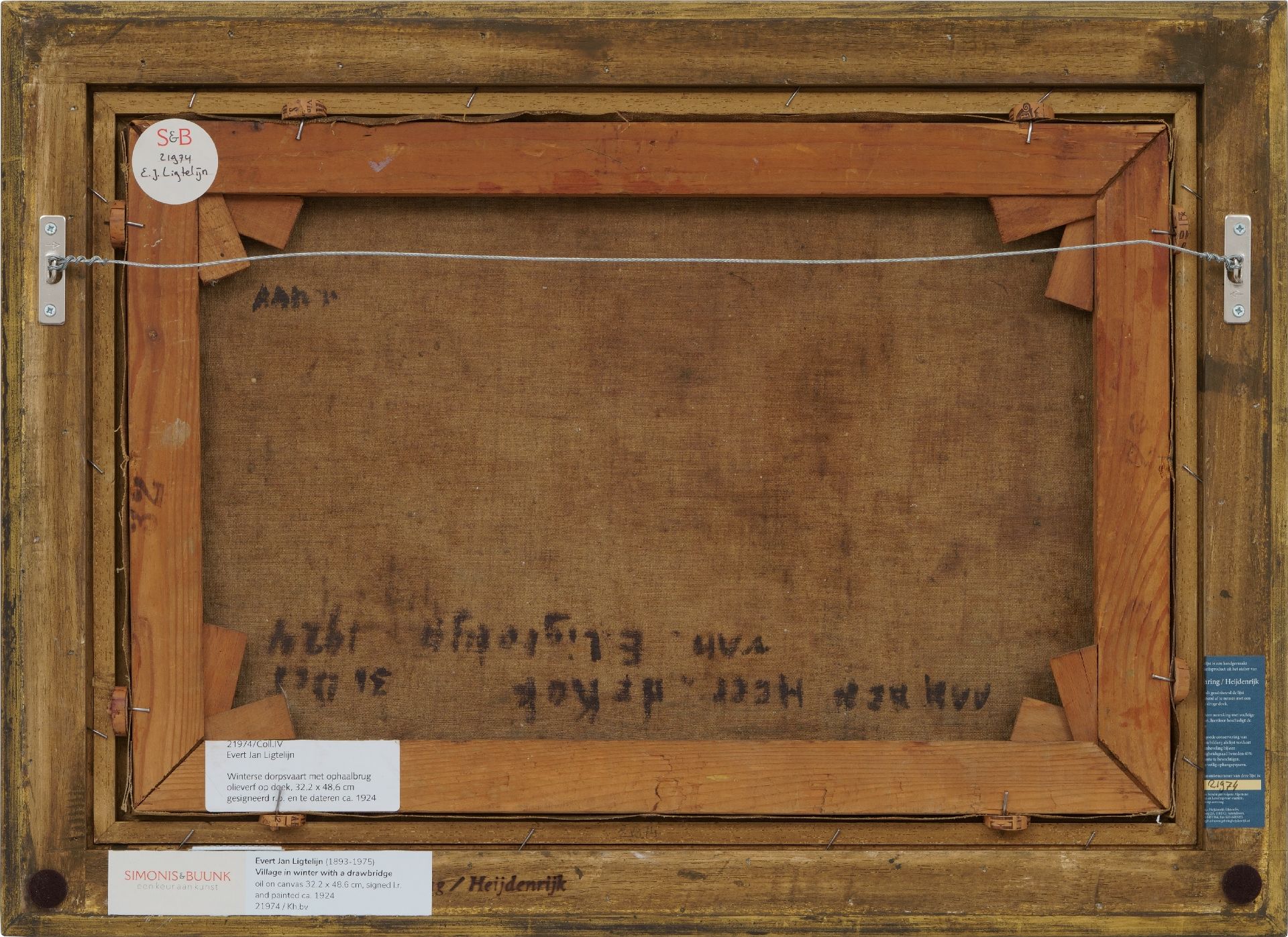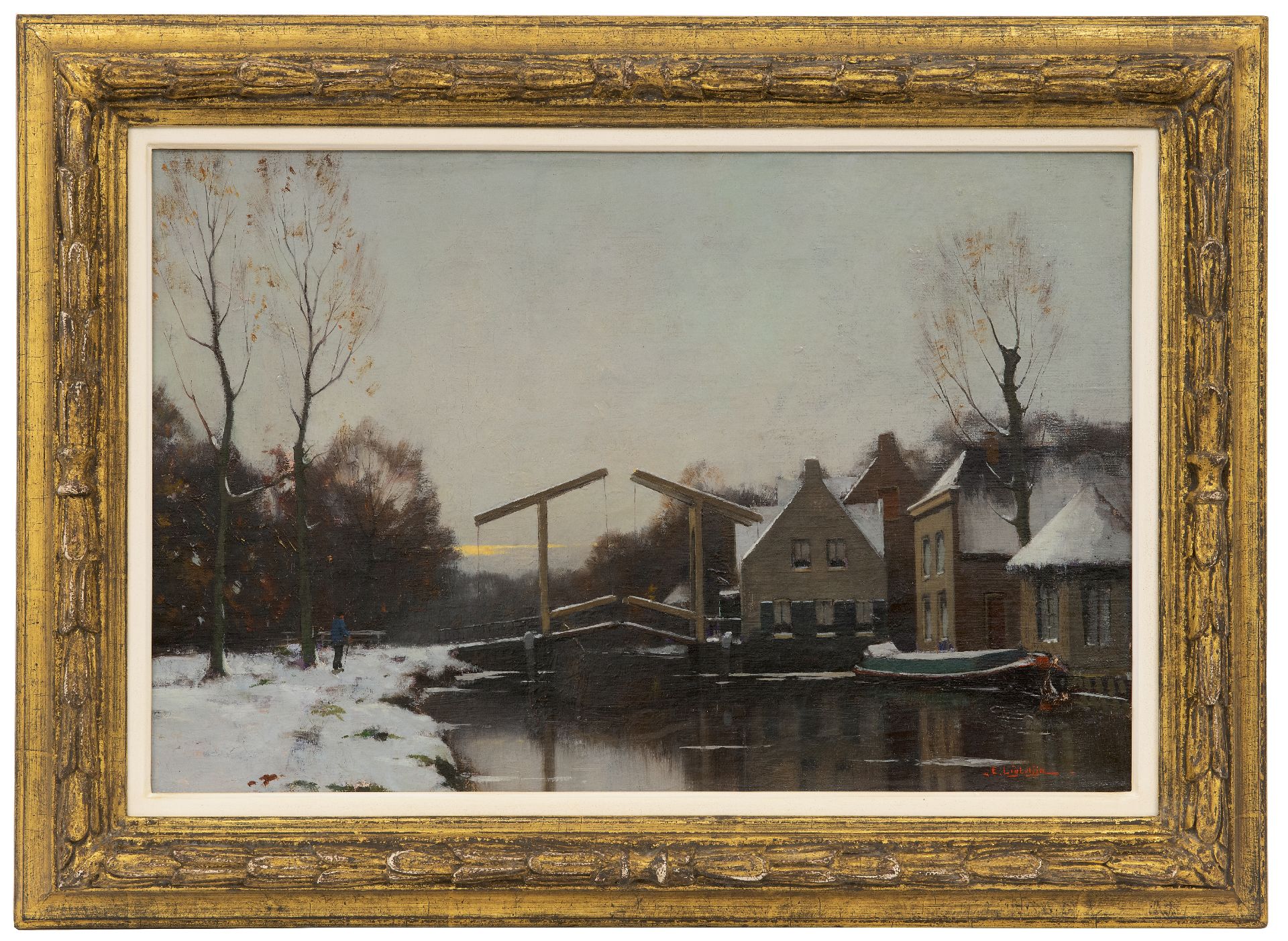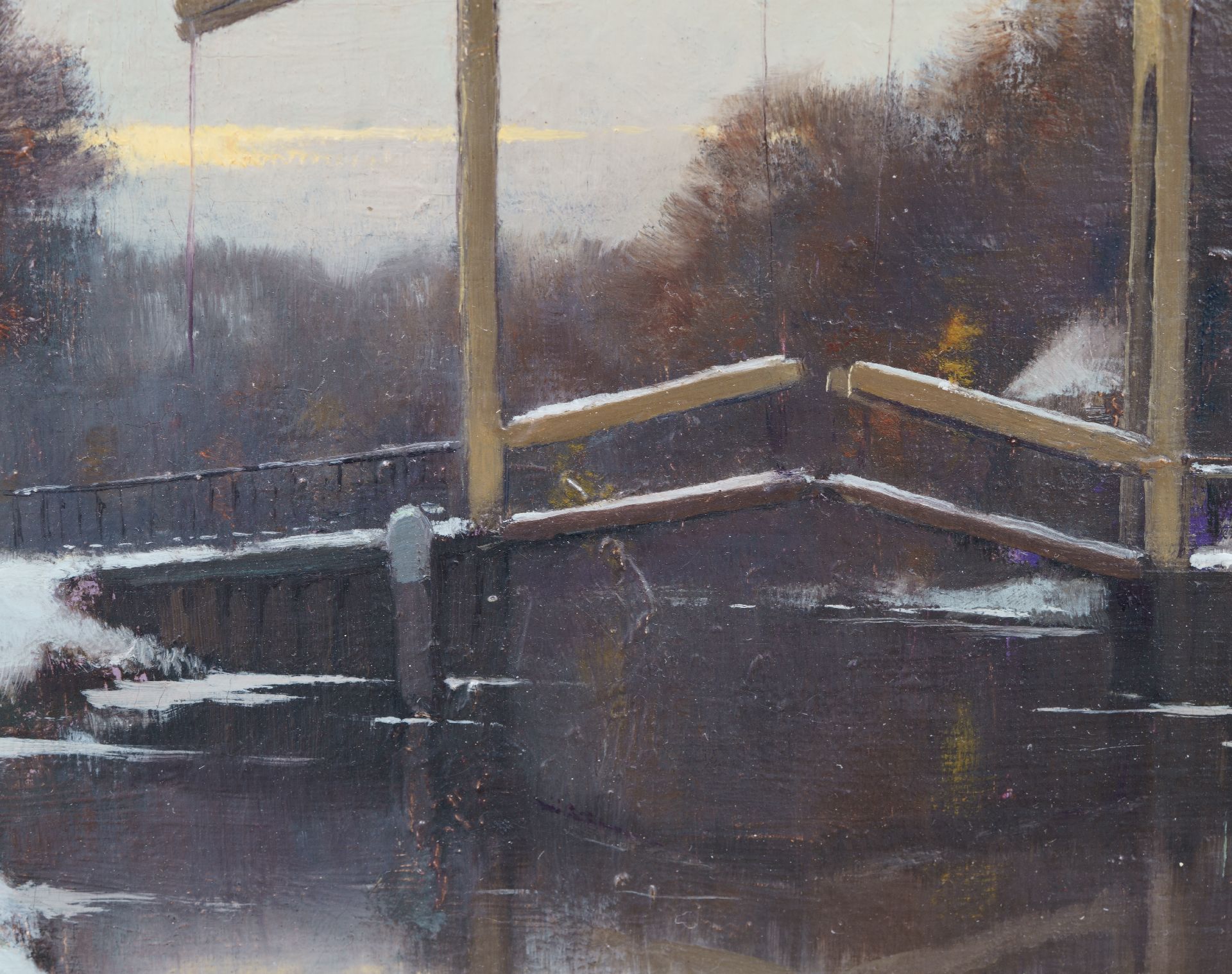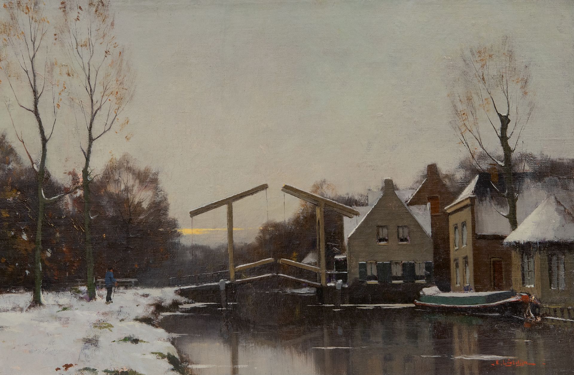 Evert Jan Ligtelijn kunstwerk • schilderij • te koop Winterse dorpsvaart met ophaalbrug