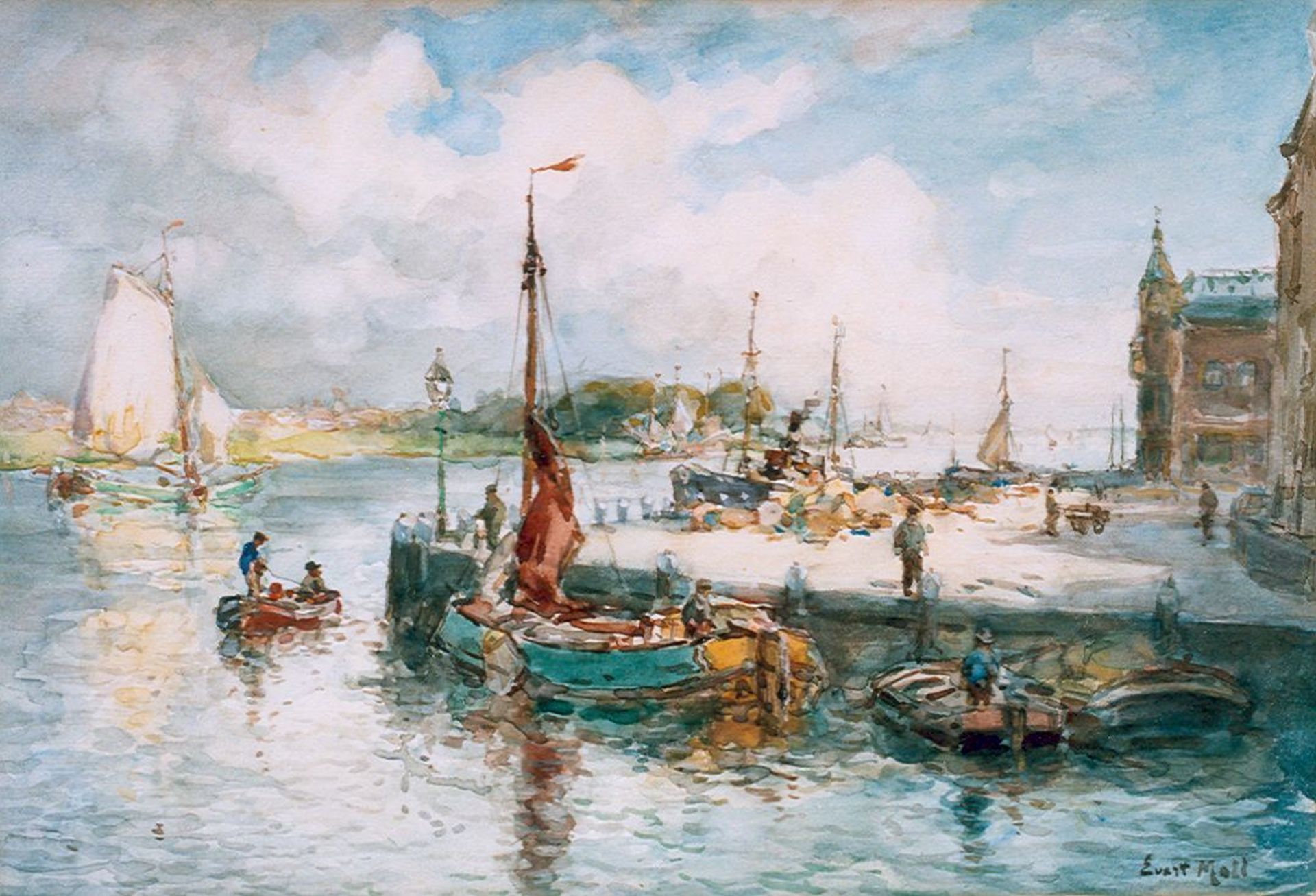 Evert Moll is vooral bekend geworden met zijn voorstellingen van de Rotterdamse haven en de scheepvaart op de Nieuwe Maas die hij in de jaren 20 en 30 van de vorige eeuw schilderde. Begonnen rond 1900 als navolger van de Haagse School verlegde Evert Moll zijn werkterrein al spoedig naar de kades en bruggen van de Maasstad. Ook de dynamiek van het havenbedrijf vormde voor de schilder een bron van inspiratie. Daarnaast blonk hij uit in tal van andere genres. Zo schilderde hij ook stadsgezichten, landschappen en kleurige, gedurfde bloemstillevens. Evert Moll was autodidact, maar kreeg raadgevingen van Willem Maris en Willem Roelofs.