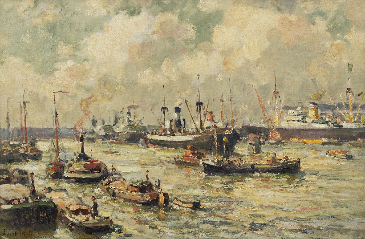 Evert Moll | Bedrijvigheid in de Rotterdamse haven, olieverf op doek, 60,1 x 100,4 cm, gesigneerd r.o.