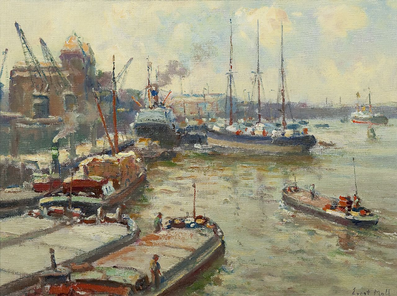 Evert Moll kunstwerk • schilderij • voorheen te koop Bedrijvigheid in de Maashaven