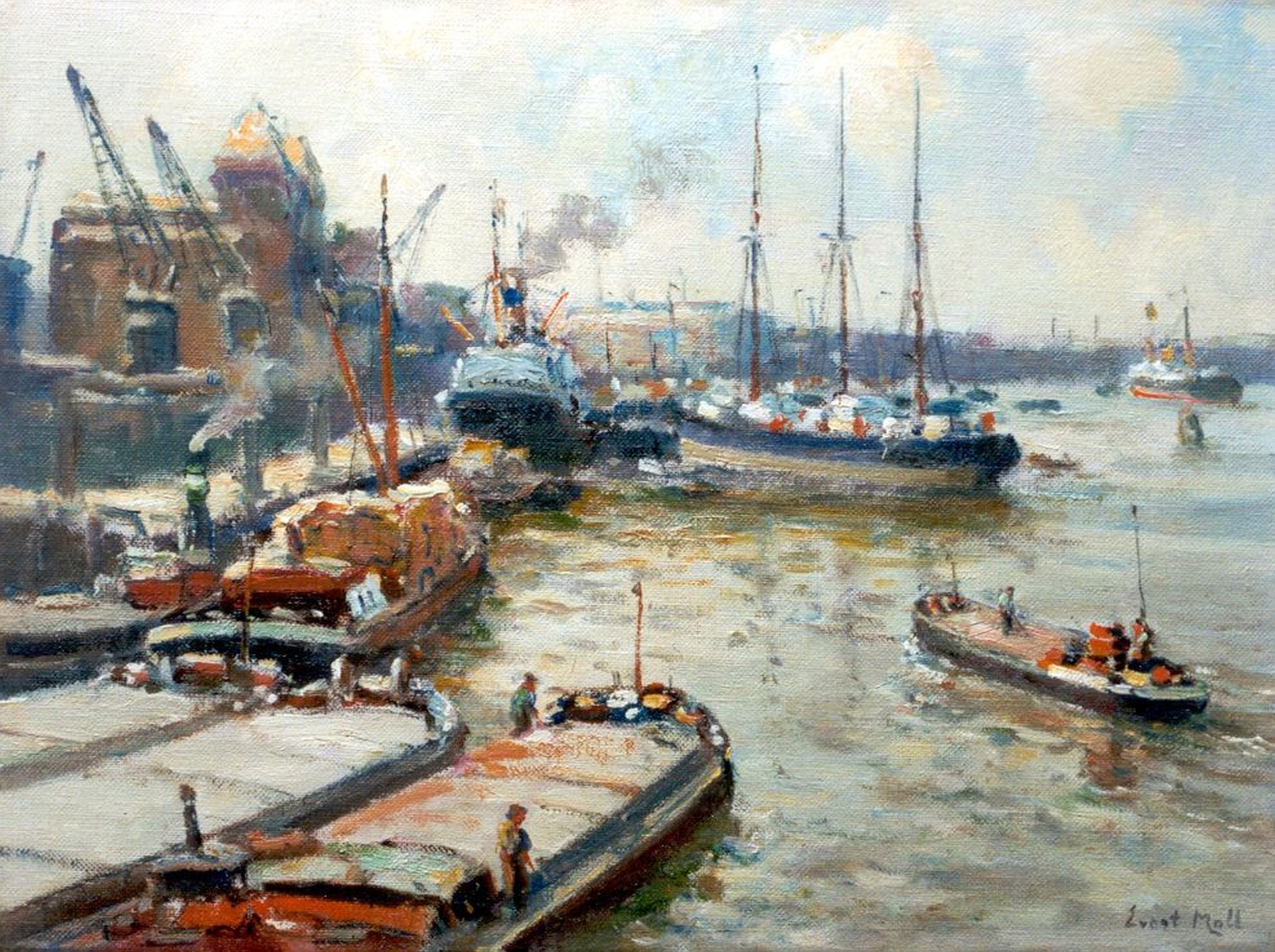 Evert Moll kunstwerk • schilderij • voorheen te koop Bedrijvigheid in de Maashaven