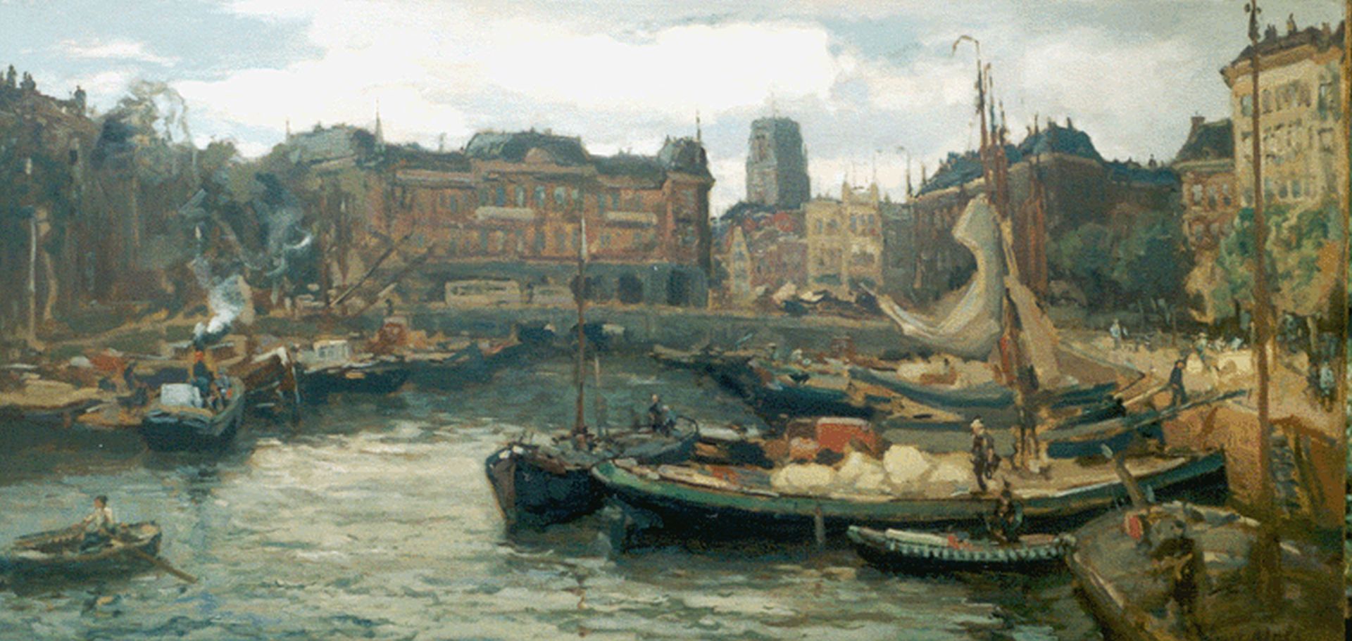 Evert Moll kunstwerk • schilderij • voorheen te koop De Oude Haven in Rotterdam met het Plan C - gebouw