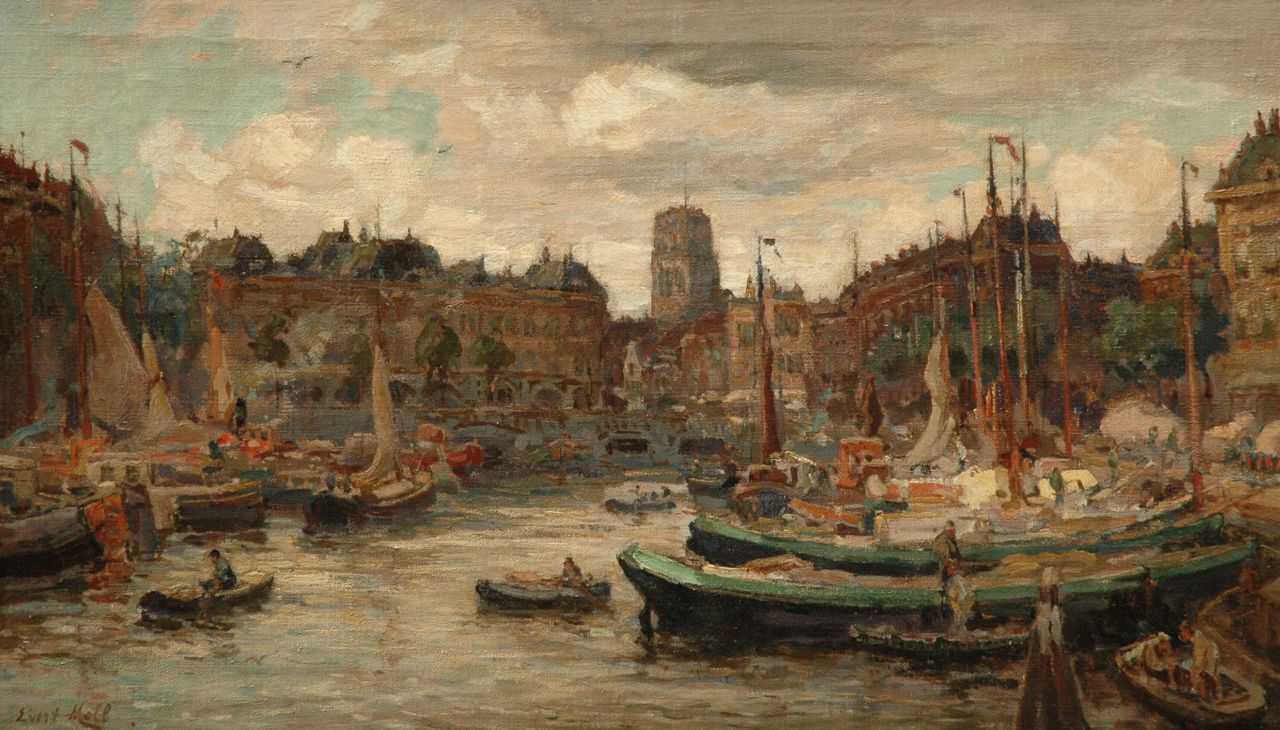Evert Moll kunstwerk • schilderij • voorheen te koop De Oude Haven met de Sint Laurenskerk, Rotterdam