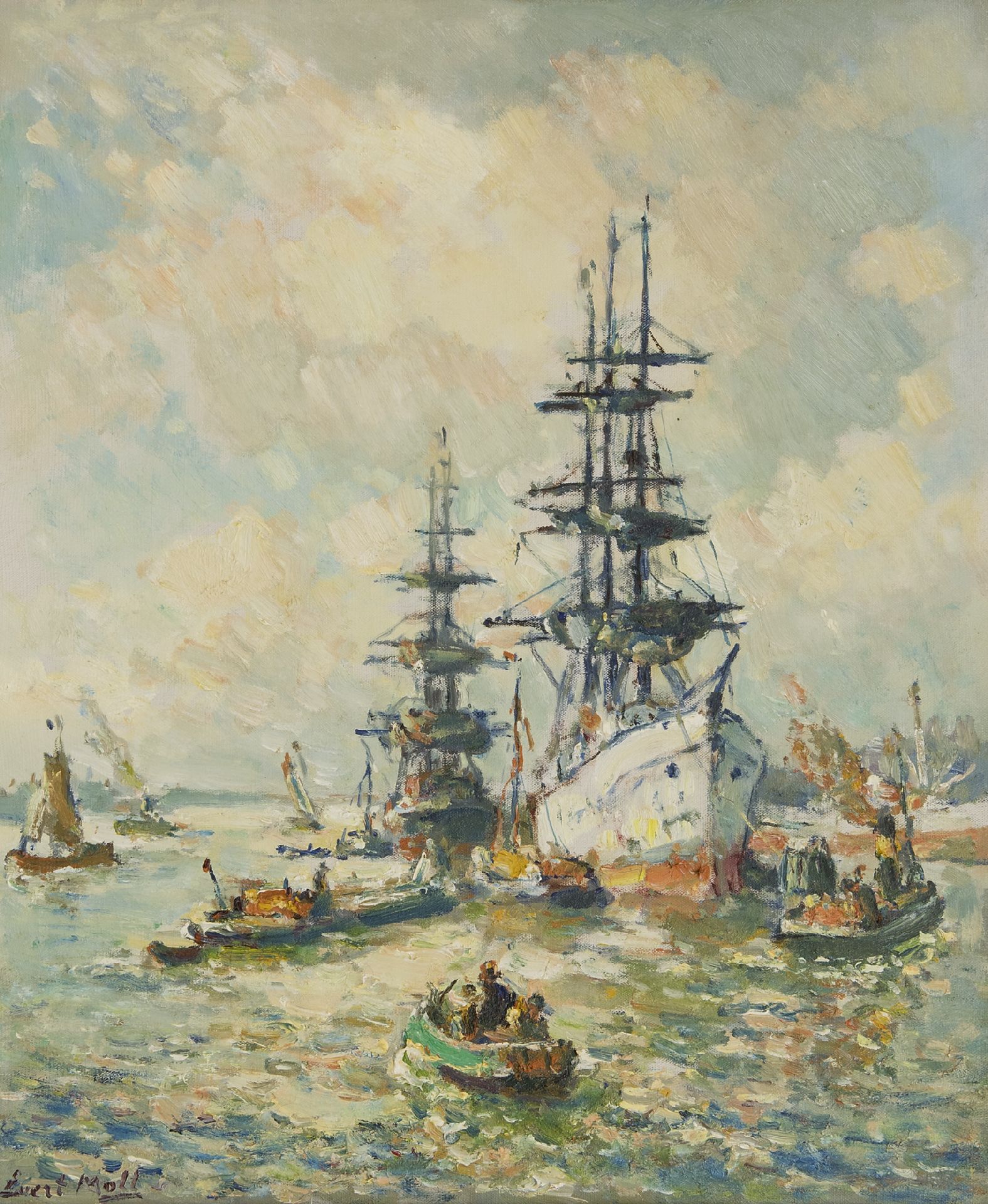 Evert Moll is vooral bekend geworden met zijn voorstellingen van de Rotterdamse haven en de scheepvaart op de Nieuwe Maas die hij in de jaren 20 en 30 van de vorige eeuw schilderde. Begonnen rond 1900 als navolger van de Haagse School verlegde Evert Moll zijn werkterrein al spoedig naar de kades en bruggen van de Maasstad. Ook de dynamiek van het havenbedrijf vormde voor de schilder een bron van inspiratie. Daarnaast blonk hij uit in tal van andere genres. Zo schilderde hij ook stadsgezichten, landschappen en kleurige, gedurfde bloemstillevens. Evert Moll was autodidact, maar kreeg raadgevingen van Willem Maris en Willem Roelofs.