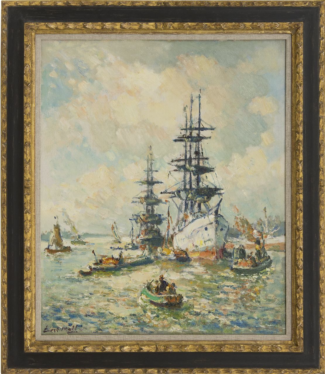 Evert Moll | Scheepvaart onder hoge wolkenlucht, olieverf op doek, 72,2 x 92,7 cm, gesigneerd r.o.
