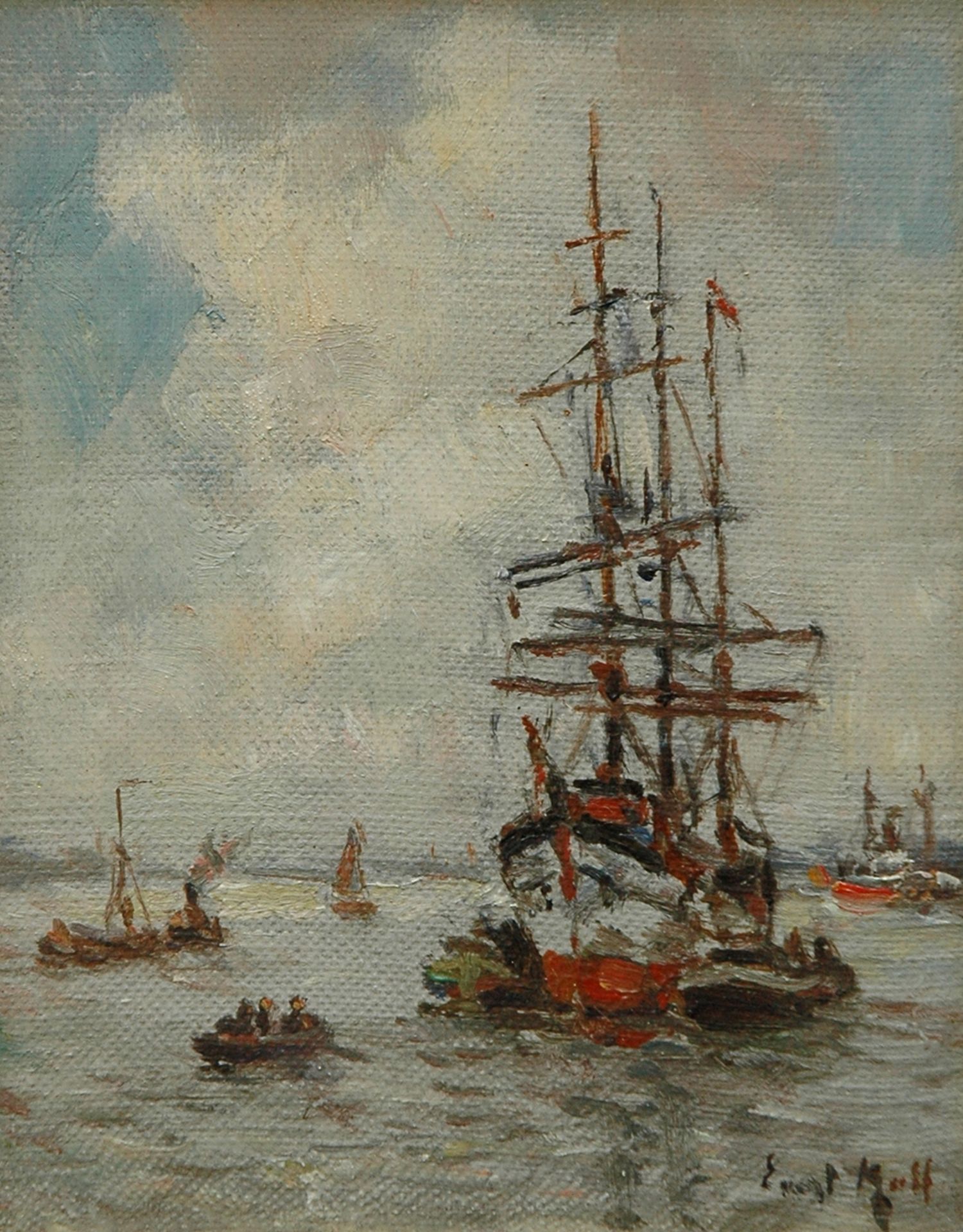 Evert Moll kunstwerk • schilderij • voorheen te koop Duwschepen met driemaster op de Nieuwe Maas, Rotterdam