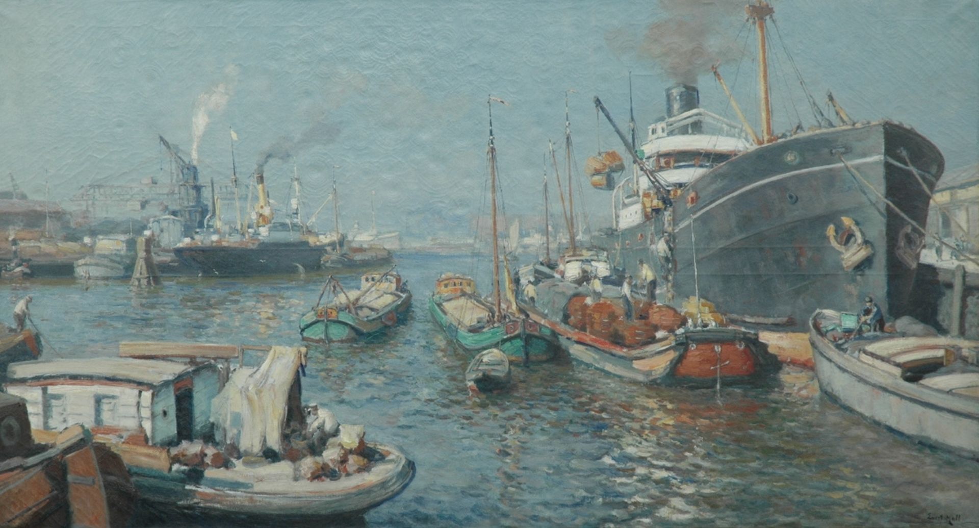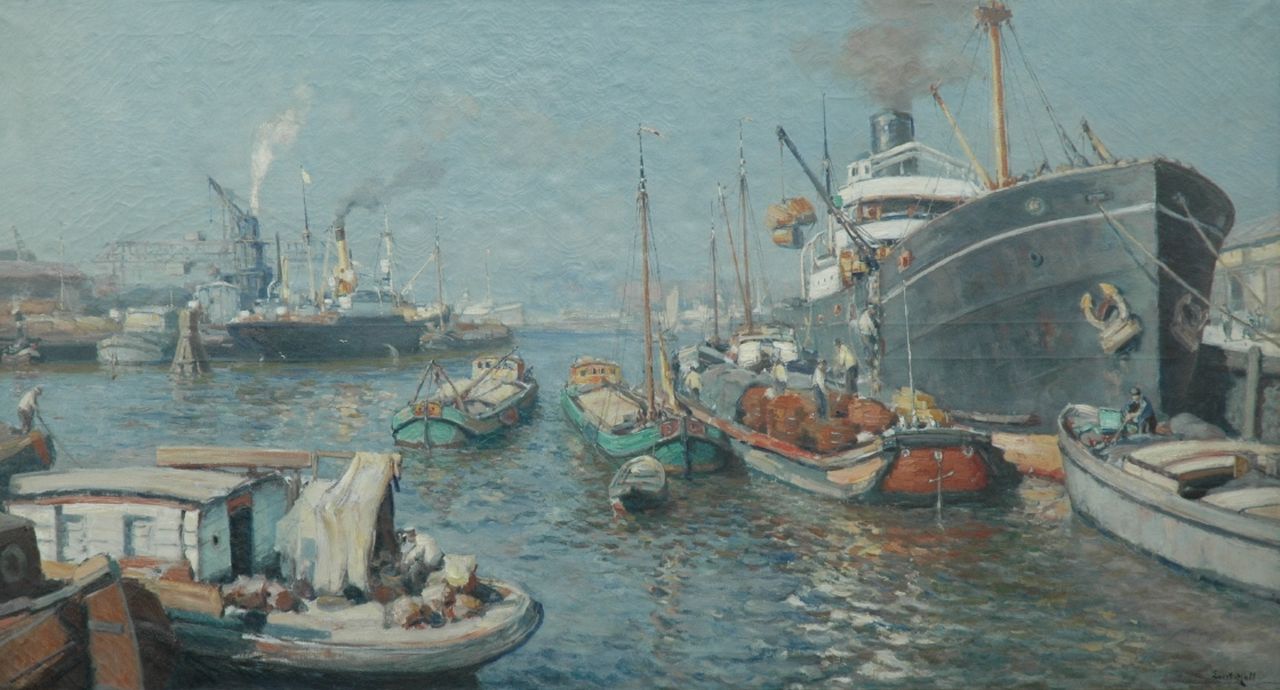 Evert Moll kunstwerk • schilderij • voorheen te koop In de Katendrechtse haven, Rotterdam