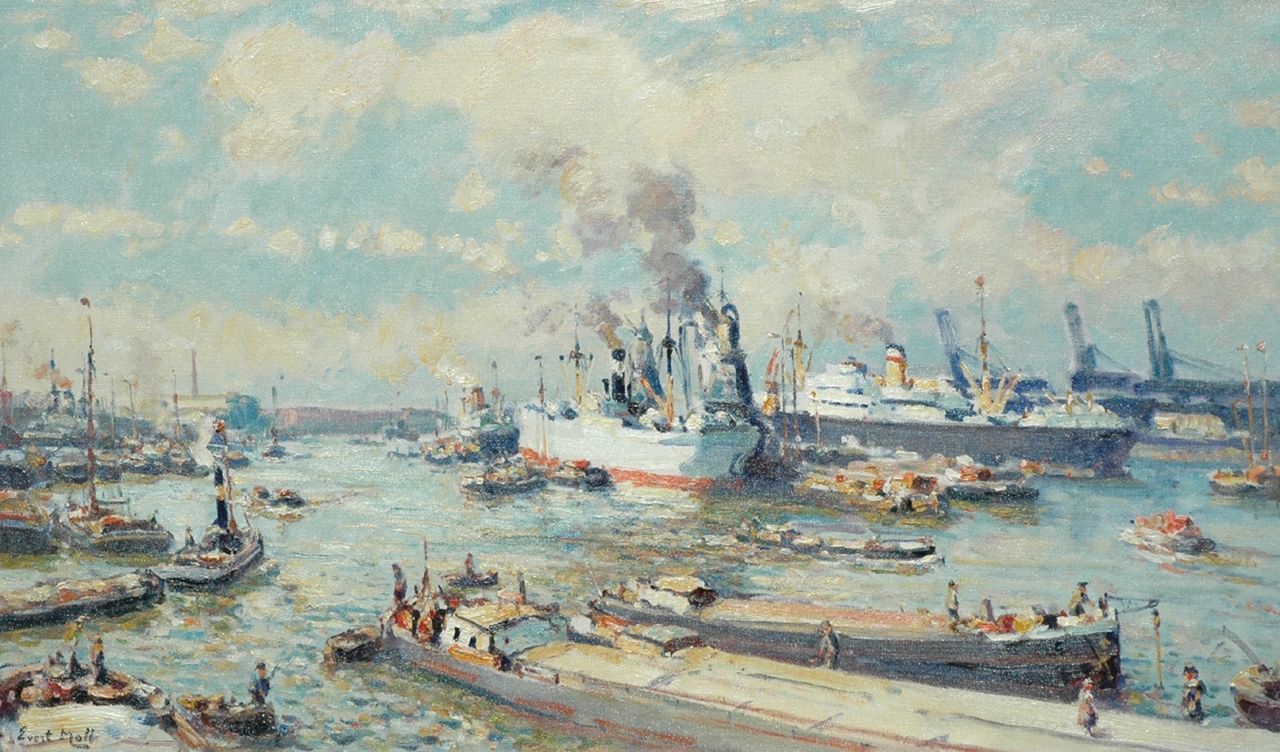Evert Moll kunstwerk • schilderij • voorheen te koop Rotterdams havengezicht