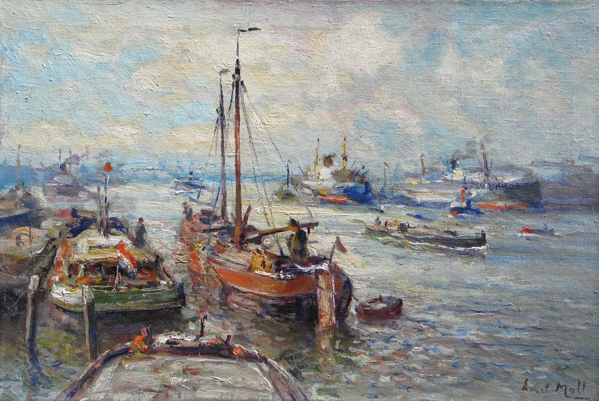 Evert Moll kunstwerk • schilderij • voorheen te koop Scheepvaartverkeer bij Rotterdam