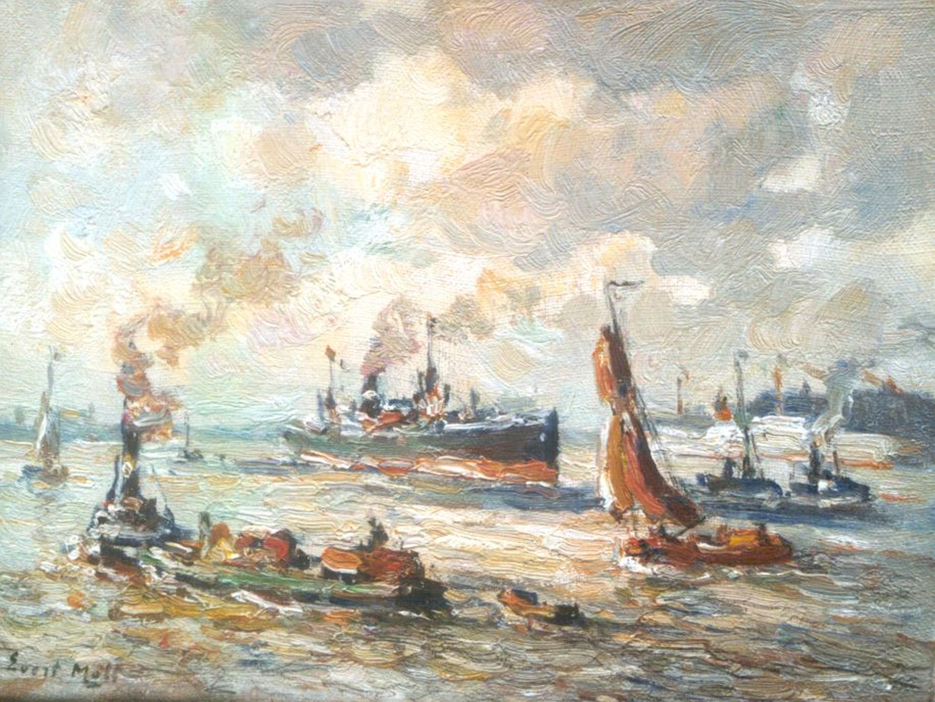 Evert Moll kunstwerk • schilderij • voorheen te koop Schepen in de haven van Rotterdam