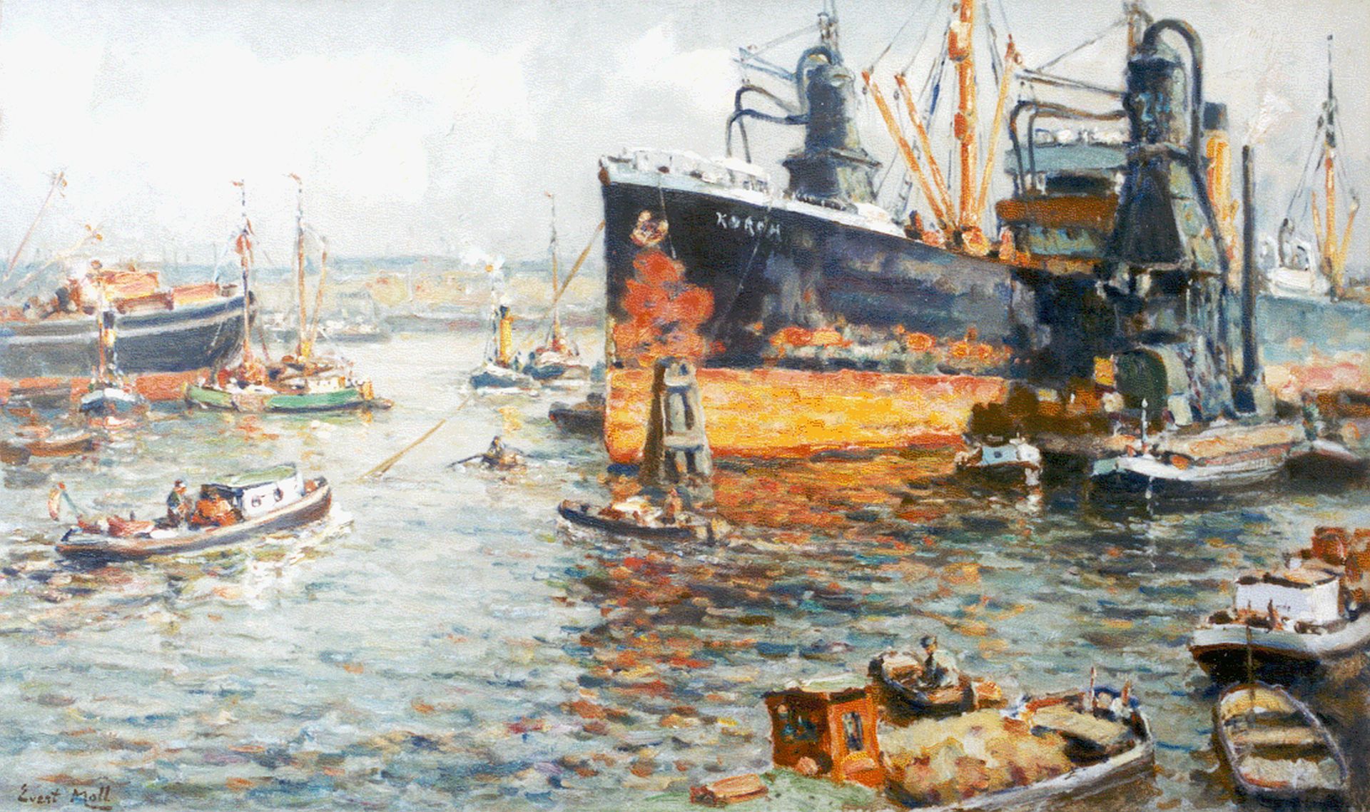 Evert Moll kunstwerk • schilderij • voorheen te koop Schepen in de Rotterdamse haven