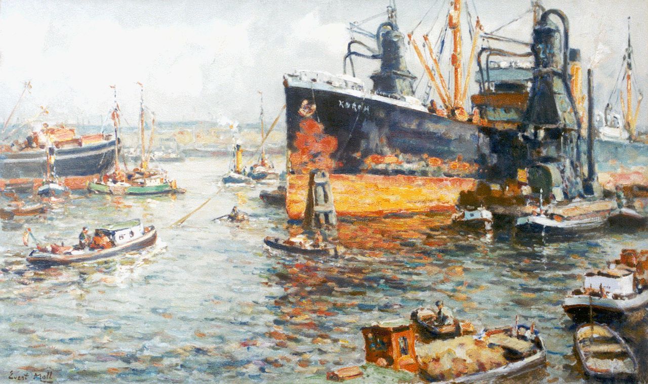 Evert Moll is een van de bekendste Nederlandse schilders van impressionistische riviergezichten en van de haven van Rotterdam. Hij vormde zich als schilder zelf, kreeg wel raadgevingen van Willem Maris. In zijn laatste jaren schilderde hij ook gedurfd opgezette, kleurige stillevens. Musea: o.a. Museum Boymans-van Beuningen in Rotterdam.