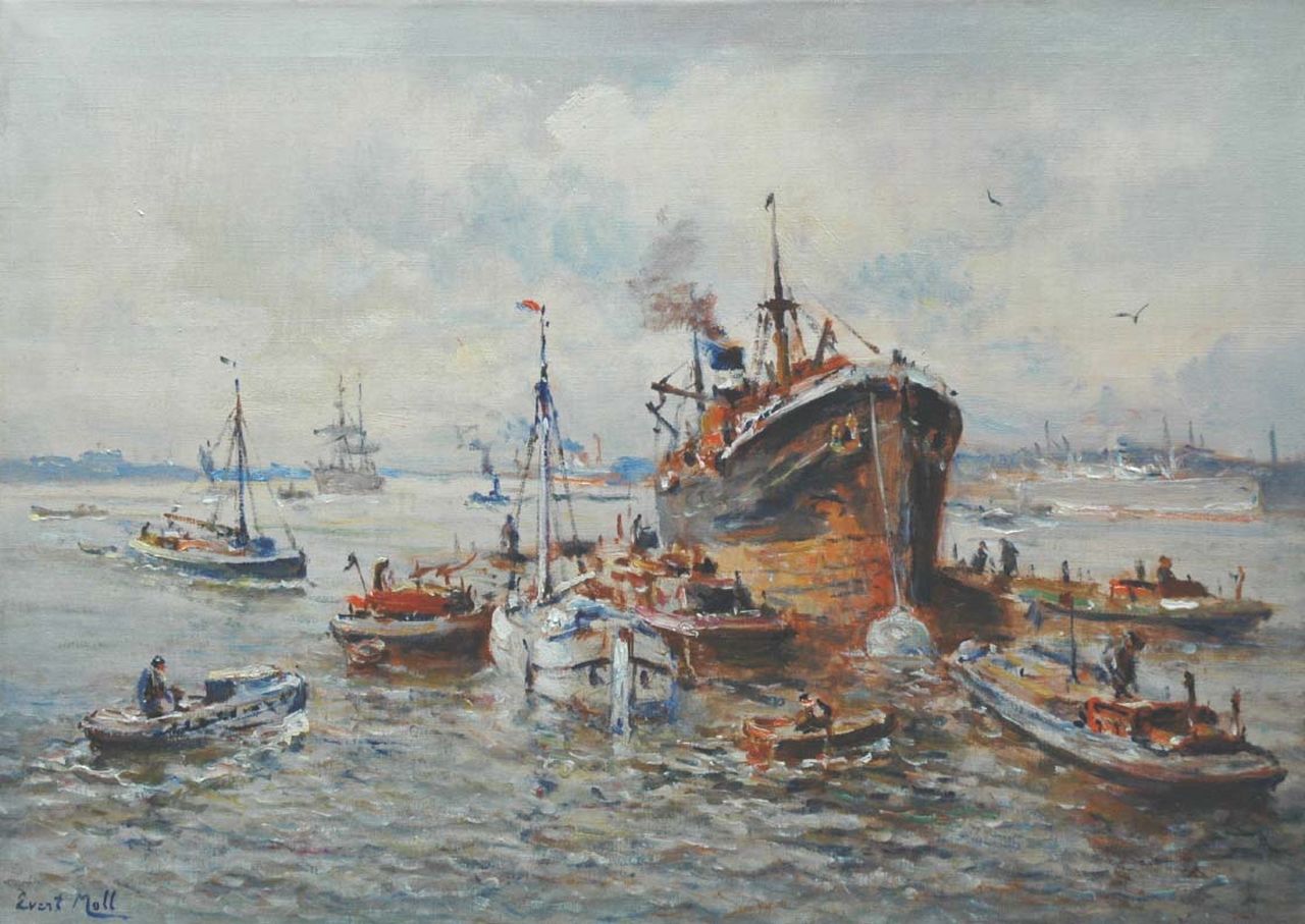 Evert Moll is vooral bekend geworden met zijn voorstellingen van de Rotterdamse haven en de scheepvaart op de Nieuwe Maas die hij in de jaren 20 en 30 van de vorige eeuw schilderde. Begonnen rond 1900 als navolger van de Haagse School verlegde Evert Moll zijn werkterrein al spoedig naar de kades en bruggen van de Maasstad. Ook de dynamiek van het havenbedrijf vormde voor de schilder een bron van inspiratie. Daarnaast blonk hij uit in tal van andere genres. Zo schilderde hij ook stadsgezichten, landschappen en kleurige, gedurfde bloemstillevens. Evert Moll was autodidact, maar kreeg raadgevingen van Willem Maris en Willem Roelofs.