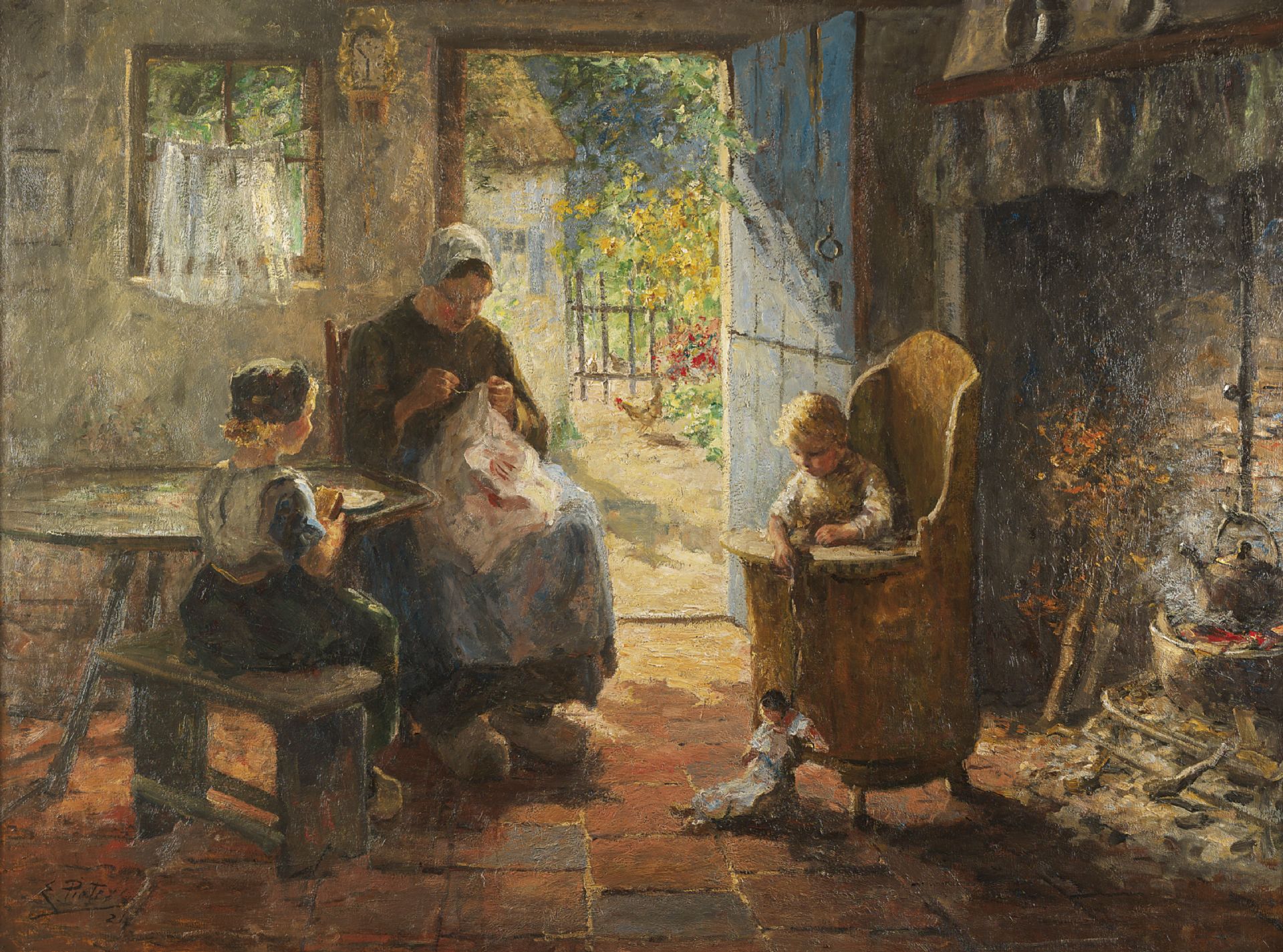 Evert Pieters, in 1856 geboren in Amsterdam, vertrok op 23-jarige leeftijd naar de Academie van Beeldende Kunsten in Antwerpen. Na een verblijf in België en Parijs vestigde hij zich in Blaricum, waar de Gooise boerenbevolking hem inspireerde tot het schilderen van zonnige boereninterieurs met moeders en spelende kinderen en tuinen in bloei. Door zijn zuidelijke, kleurige palet onderscheidt hij zich van andere Gooise schilders als Neuhuys en Kever. In deze Gooise tijd raakt de familie Pieters ook bevriend met kunstverzamelaars William en Anna Singer, die ook werk van Pieters kopen. Evert Pieters had veel succes met zijn werk, vooral bij de Amerikanen die ons land bezochten. De schilder blonk ook uit in het schilderen van strandgezichten met garnalen- en schelpenvissers in Katwijk. Na 1920 schilderde hij een aantal dromerig-impressionistische portretten en naakten.