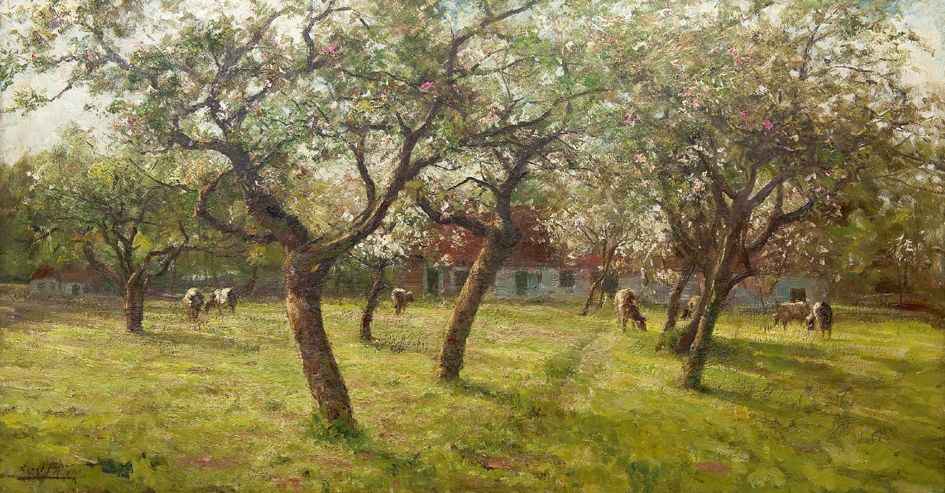 Evert Pieters kunstwerk • schilderij • voorheen te koop Grazende koeien in een boomgaard