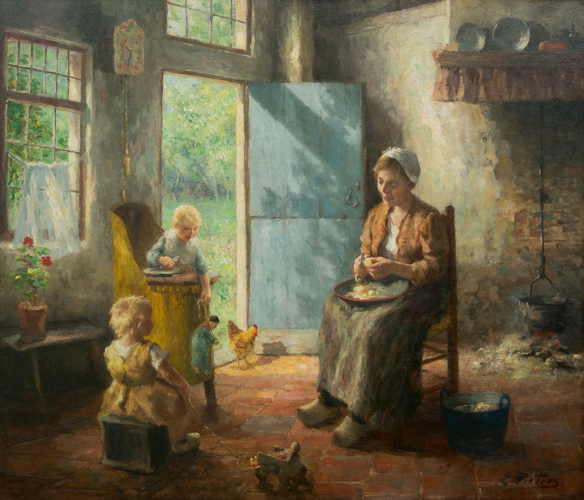 Evert Pieters, in 1856 geboren in Amsterdam, vertrok op 23-jarige leeftijd naar de Academie van Beeldende Kunsten in Antwerpen. Na een verblijf in België en Parijs vestigde hij zich in Blaricum, waar de Gooise boerenbevolking hem inspireerde tot het schilderen van zonnige boereninterieurs met moeders en spelende kinderen en tuinen in bloei. Door zijn zuidelijke, kleurige palet onderscheidt hij zich van andere Gooise schilders als Neuhuys en Kever. In deze Gooise tijd raakt de familie Pieters ook bevriend met kunstverzamelaars William en Anna Singer, die ook werk van Pieters kopen. Evert Pieters had veel succes met zijn werk, vooral bij de Amerikanen die ons land bezochten. De schilder blonk ook uit in het schilderen van strandgezichten met garnalen- en schelpenvissers in Katwijk. Na 1920 schilderde hij een aantal dromerig-impressionistische portretten en naakten.