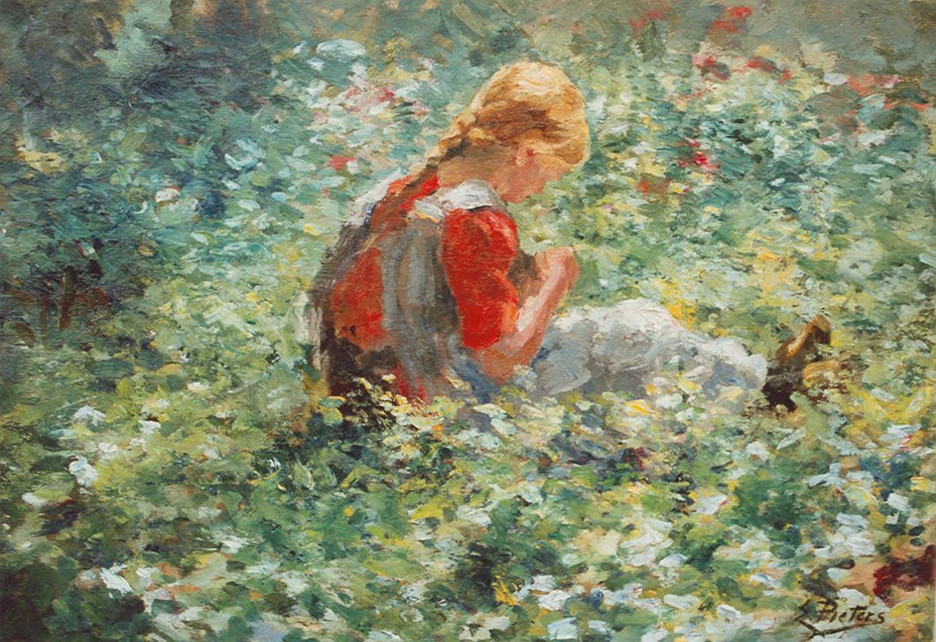Evert Pieters kunstwerk • schilderij • voorheen te koop Jong meisje in zonnige tuin