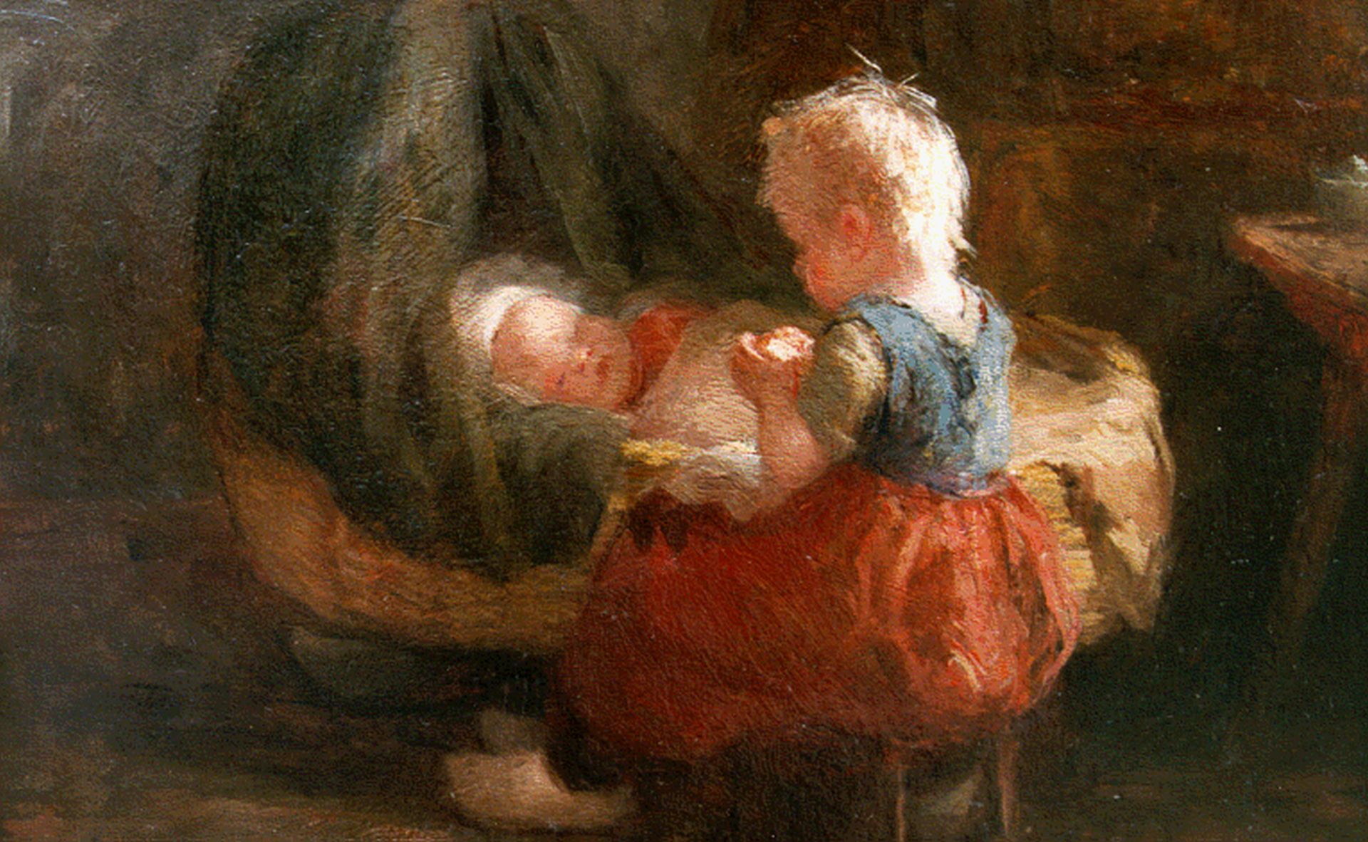 Evert Pieters kunstwerk • schilderij • voorheen te koop Meisje bij baby in de schommelwieg