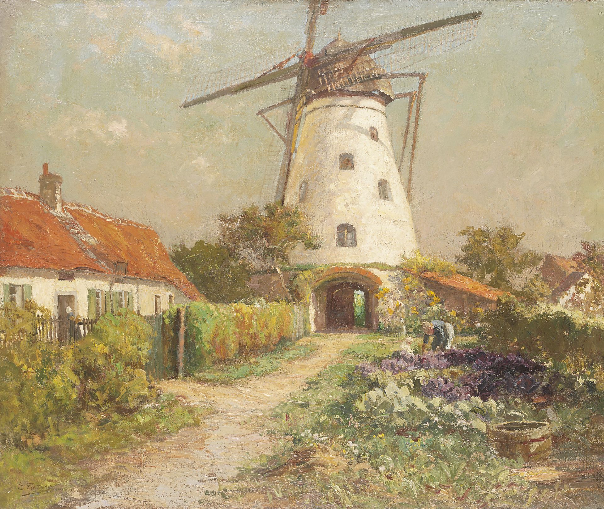 Evert Pieters kunstwerk • schilderij • voorheen te koop Moestuin bij een molen