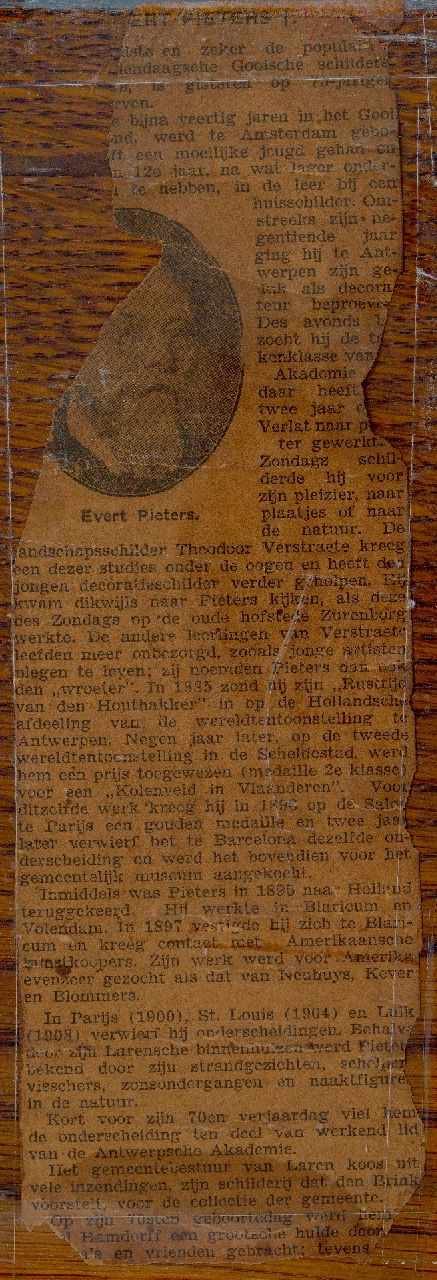 Evert Pieters, in 1856 geboren in Amsterdam, vertrok op 23-jarige leeftijd naar de Academie van Beeldende Kunsten in Antwerpen. Na een verblijf in België en Parijs vestigde hij zich in Blaricum, waar de Gooise boerenbevolking hem inspireerde tot het schilderen van zonnige boereninterieurs met moeders en spelende kinderen en tuinen in bloei. Door zijn zuidelijke, kleurige palet onderscheidt hij zich van andere Gooise schilders als Neuhuys en Kever. In deze Gooise tijd raakt de familie Pieters ook bevriend met kunstverzamelaars William en Anna Singer, die ook werk van Pieters kopen. Evert Pieters had veel succes met zijn werk, vooral bij de Amerikanen die ons land bezochten. De schilder blonk ook uit in het schilderen van strandgezichten met garnalen- en schelpenvissers in Katwijk. Na 1920 schilderde hij een aantal dromerig-impressionistische portretten en naakten.