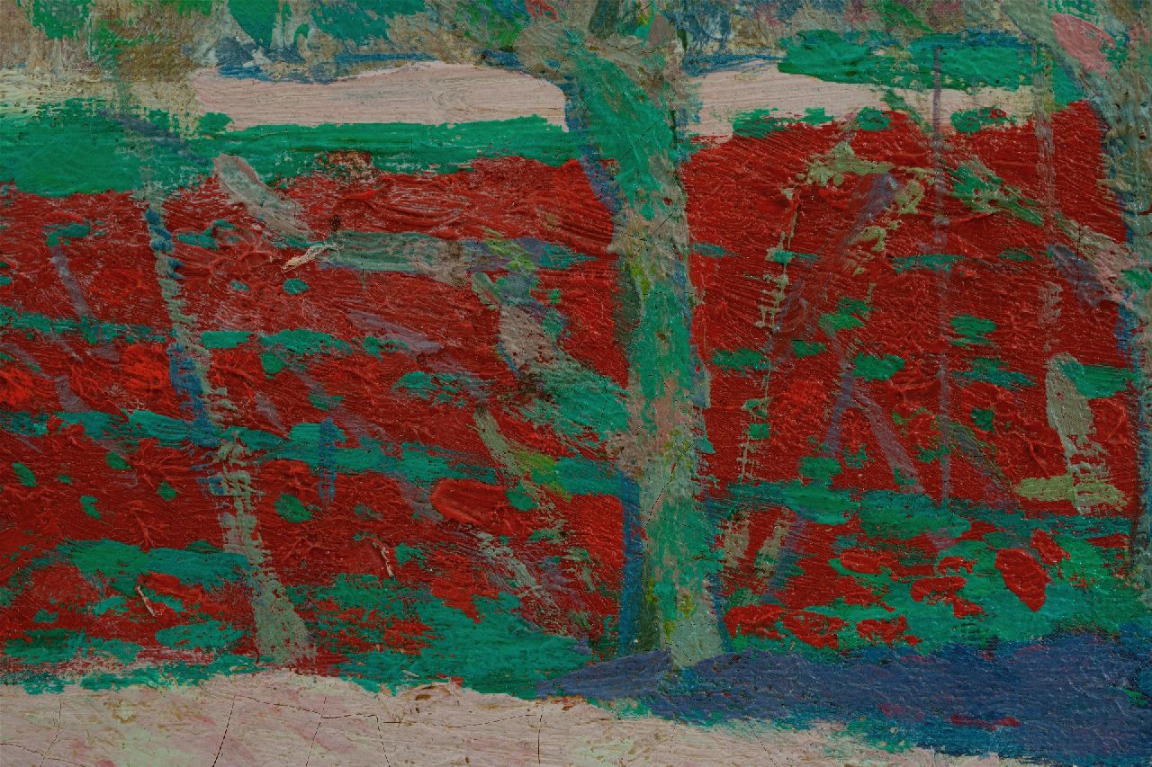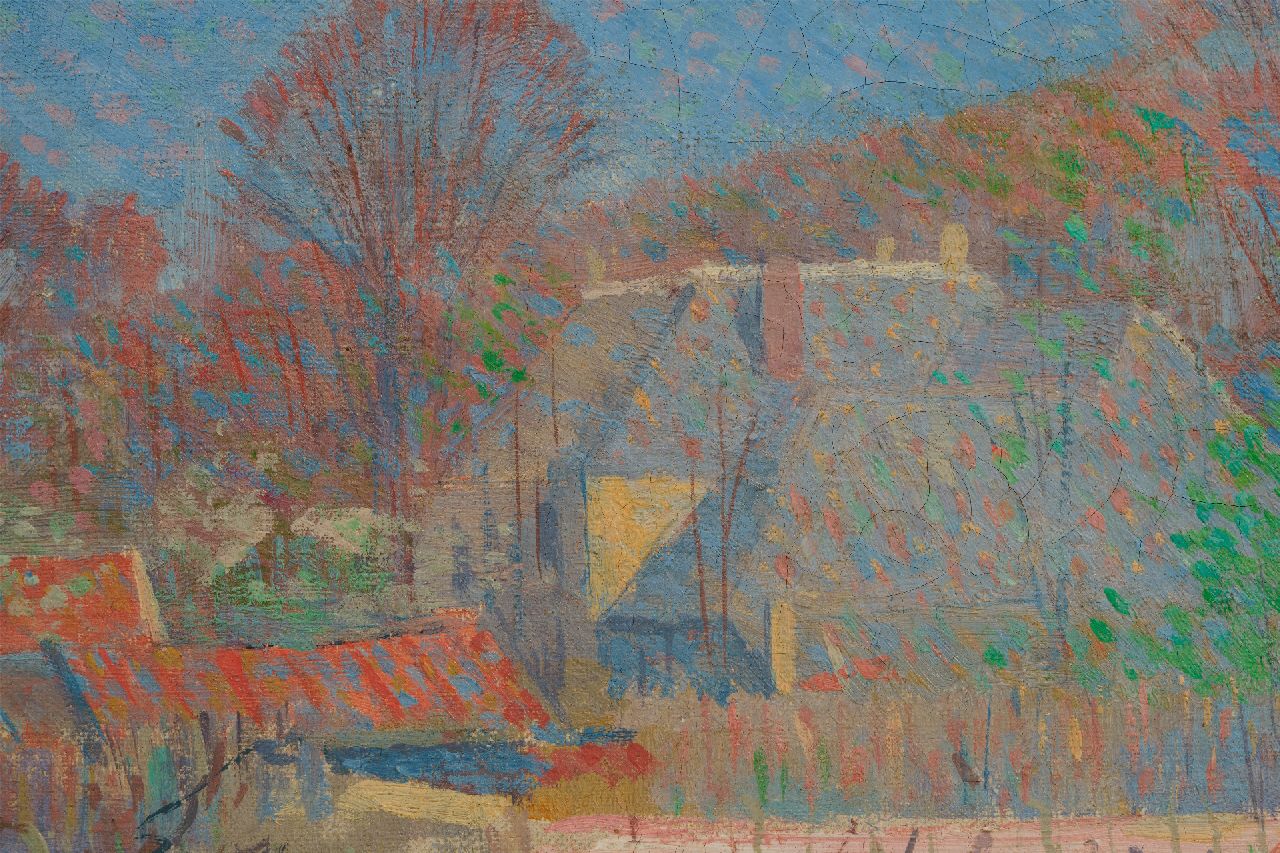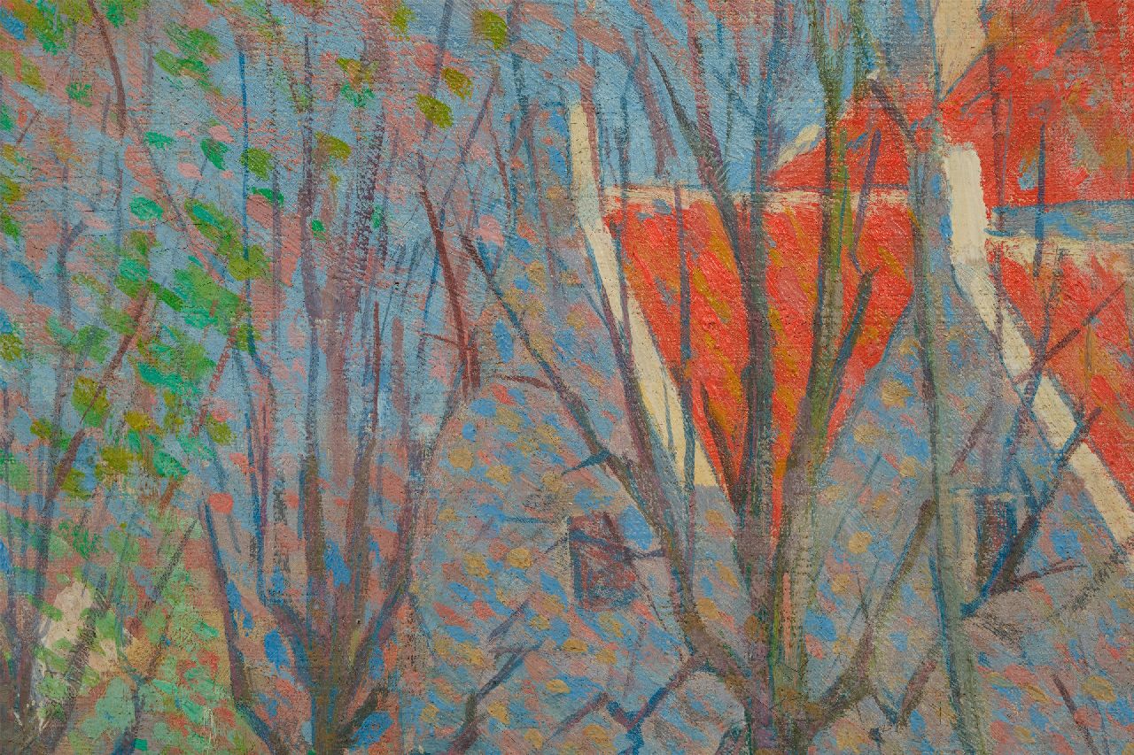 Ferdinand Hart Nibbrig trekt na zijn studie aan de Rijkskademie in Amsterdam in 1888 naar Parijs om zich in het ‘nieuwe’ artistieke klimaat onder te dompelen. Hij komt er in aanraking met het werk van de impressionistische schilders Claude Monet, Camille Pisarro, Georges Seurat en Vincent van Gogh. Zij braken met de conventionele schildertradities en schilderden in andere technieken met felle, ongemengde kleuren. Terug in Nederland weet Hart Nibbrig aanvankelijk niet goed hoe hij deze indrukken moest verwerken en is hij een aantal jaren op zoek naar een eigen stijl. Hij experimenteert met verschillende technieken om verf aan te brengen in nog steeds donkere aardtinten met weinig licht-donker effect. Maar als hij voorjaar 1892 vanuit Amsterdam op aanraden van zijn vriend Simon Moulijn een fietstocht maakt langs de bloeiende bollenvelden bij Bennebroek en Hillegom weet hij wat hem te doen staat. De aanblik van dit feest van kleur verandert zijn palet volledig. De donkere kleuren in een korte penseelvoering maken plaats voor frisrode, felblauwe en witte kleuren in een stippeltechniek die het sprankelende licht moest verbeelden. Daarmee behoorde Hart Nibbrig met ‘Co’ Breman tot de eerste schilders in Nederland die de pointillistische techniek gebruikten voor het oproepen van een warme, zomerse sfeer. Toen hij dit schilderij maakte zat Hart Nibbrig op een stukje hoger gelegen oude duinwal in Bennebroek. Deze duinwallen waren in de 17e eeuw voor een groot deel afgegraven en het zand was voornamelijk gebruikt voor de stadsuitbreiding van Amsterdam. Vanaf ca. 1850/1860 werd dit gebied in gebruik genomen voor de bollenteelt. Van waar hij zat had Hart Nibbrig een goed zicht op de wat lagergelegen bollenvelden van Bakker en Van Lierop, van wie de laatste zich had gespecialiseerd in de hyachintenteelt. Het huis aan de rechterzijde is huize Vrede-oord (nu Bennebroekerlaan 31-33). In het midden van het schilderij zien we waarschijnlijk Hotel-Restaurant De Nieuwe Geleerde Man, in 1927 afgebrand en daarna weer opgebouwd. Met dank aan Martin Bunnik, Historische Vereniging Heemstede-Bennebroek.