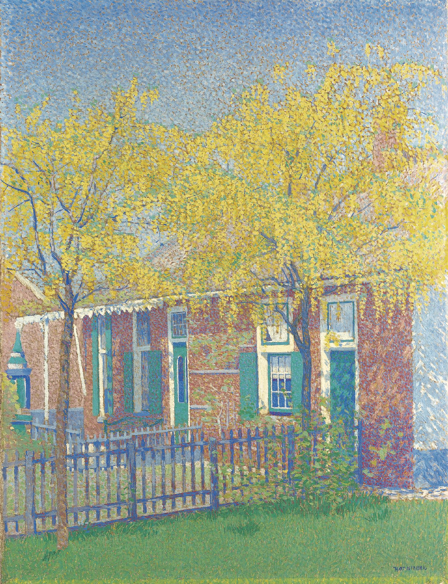 De schildersloopbaan van Ferdinand Hart Nibbrig begon conventioneel met een studie aan de Amsterdamse Rijksacademie. Tijdens een daaropvolgend verblijf in Parijs (888-1889) maakte hij kennis met het neo-impressionisme van Lucien en Camille Pissarro, wat een grote indruk op hem maakte. Vanaf 1895 begonde schilder deze techniek zelf toe te passen, echter zonder de strenge kleurvoorschriften waar het pointillisme in Frankrijk aan onderworpen was. Hart Nibbrig's wilde met de stippeltechniek de tinteling van het zonlicht weergeven. Daarvoor koos hij nu eens een zeer fijn pointille, dan weer een wat lossere techniek van verftoetsen gecombineerd met kleurvegen en contourlijnen. Musea: o.a. Singer Museum in Laren.