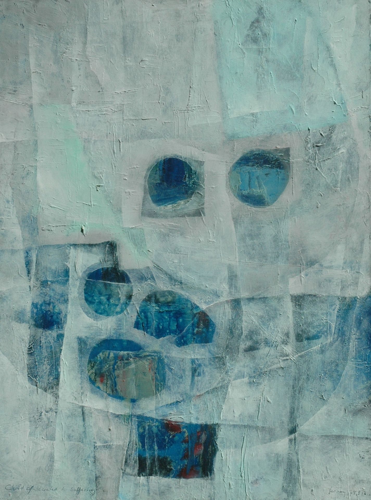 annotatie linksonder: 'child consegreted [sic] to suffering', op spieraam 'à Paul Klee - hommage - fernay 74' en verso 'child consegreted [sic] to suffering (kind, opgedragen aan het lijden), Biafra - India - vul zelf maar in - fernay'.