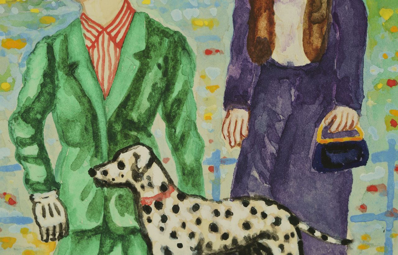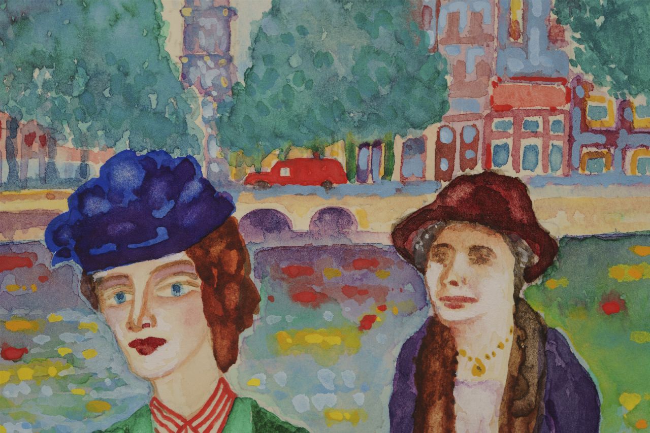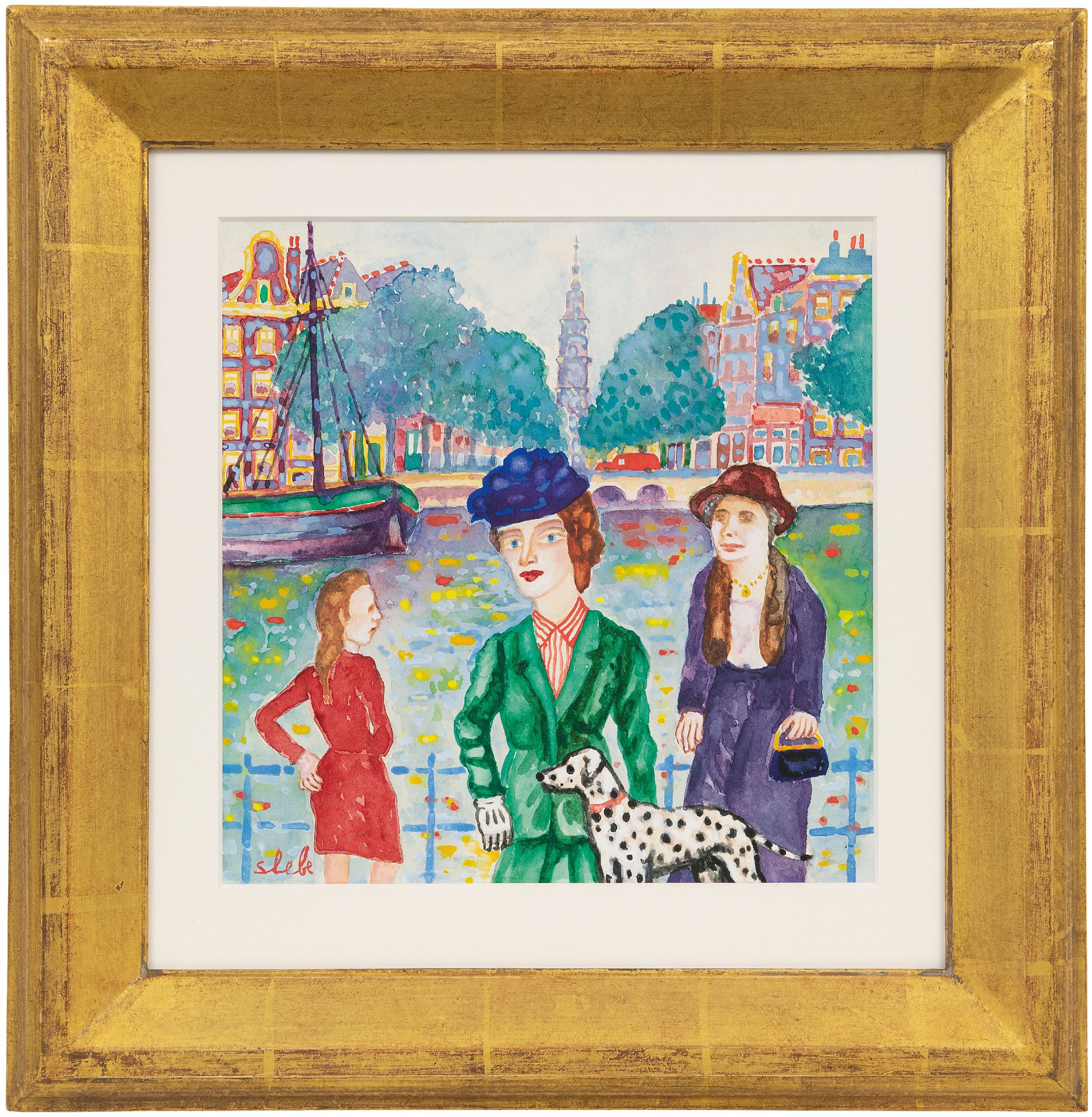 Ferry Slebe kunstwerk • aquarel • tekening • voorheen te koop Drie vrouwen en een dalmatiër in Amsterdam
