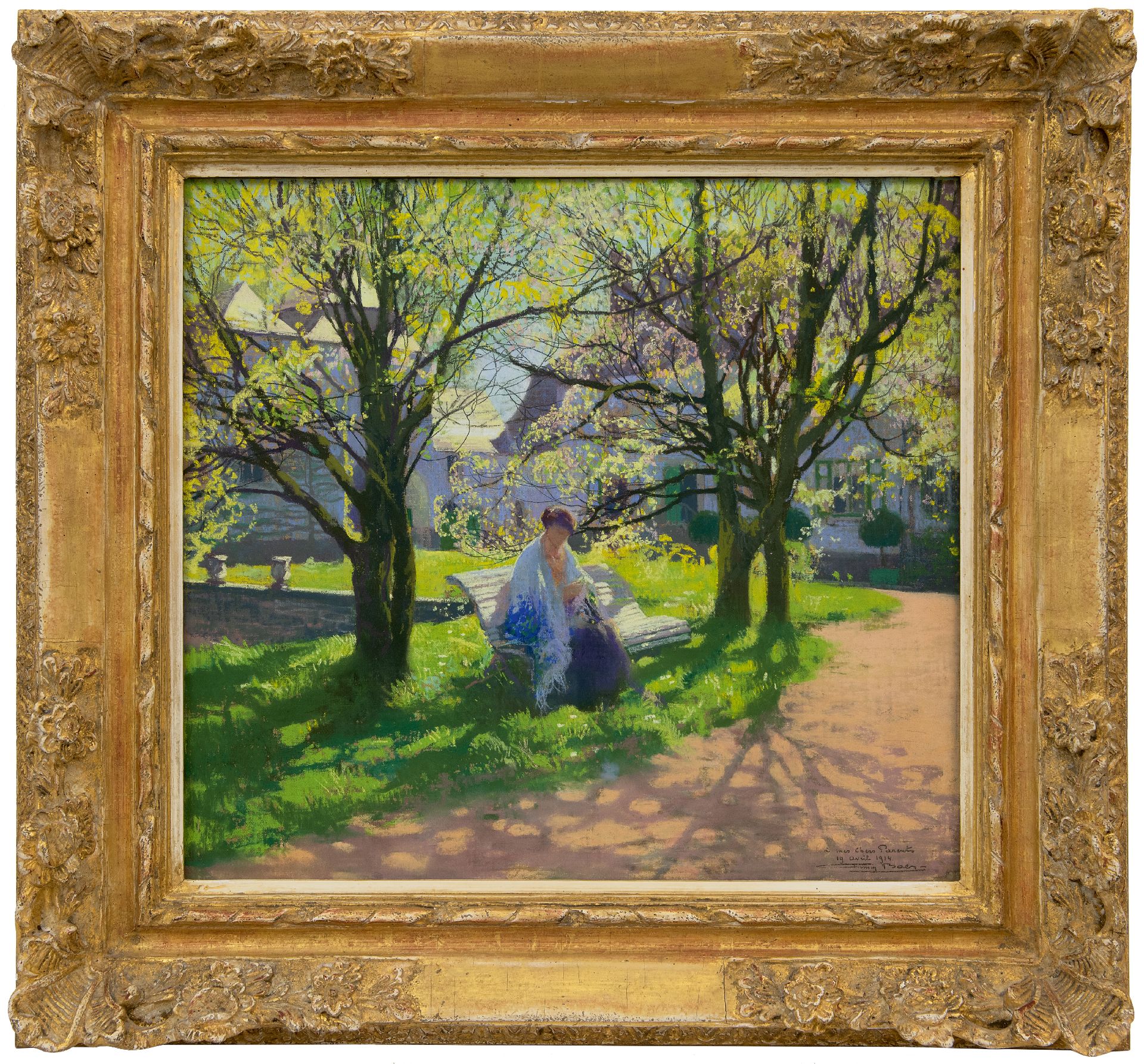 Firmin Baes kunstwerk • aquarel • tekening • voorheen te koop Jonge vrouw, breiend in de tuin