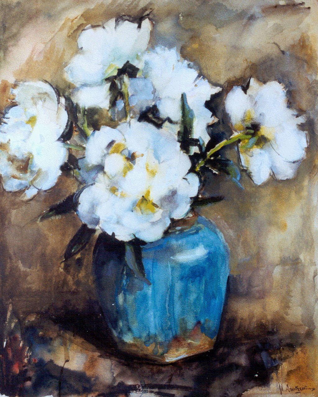 Floris Arntzenius kunstwerk • aquarel • tekening • voorheen te koop Stilleven met pioenrozen in blauwe vaas