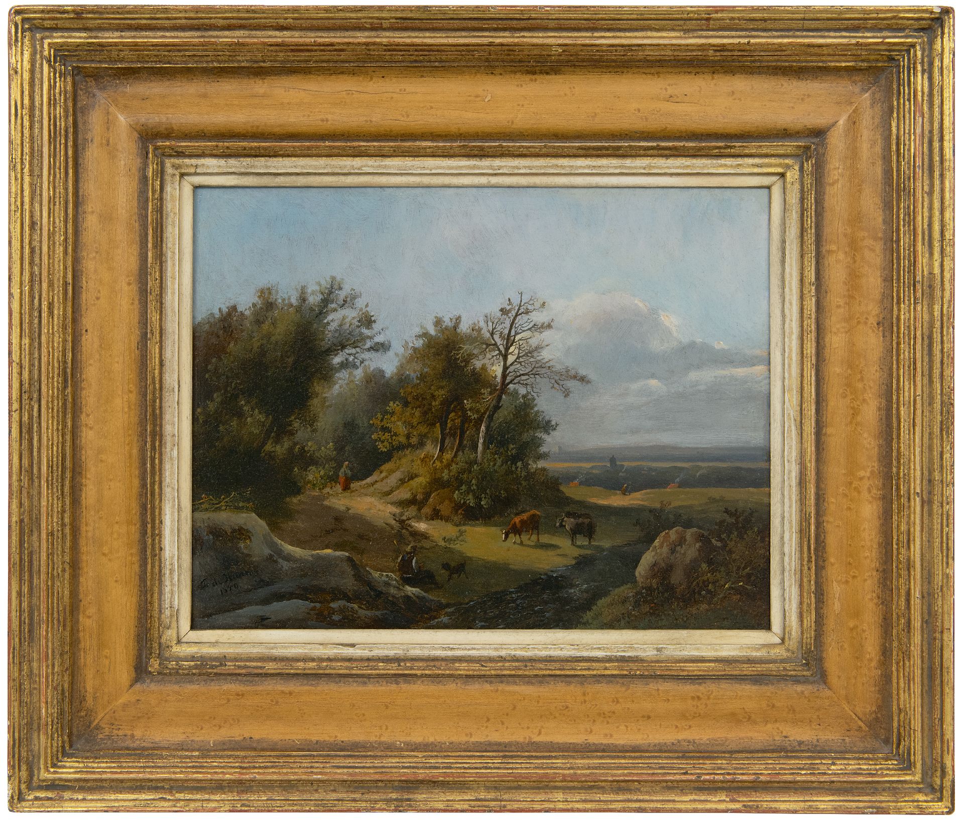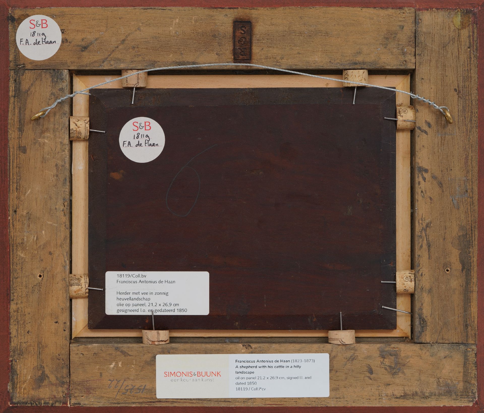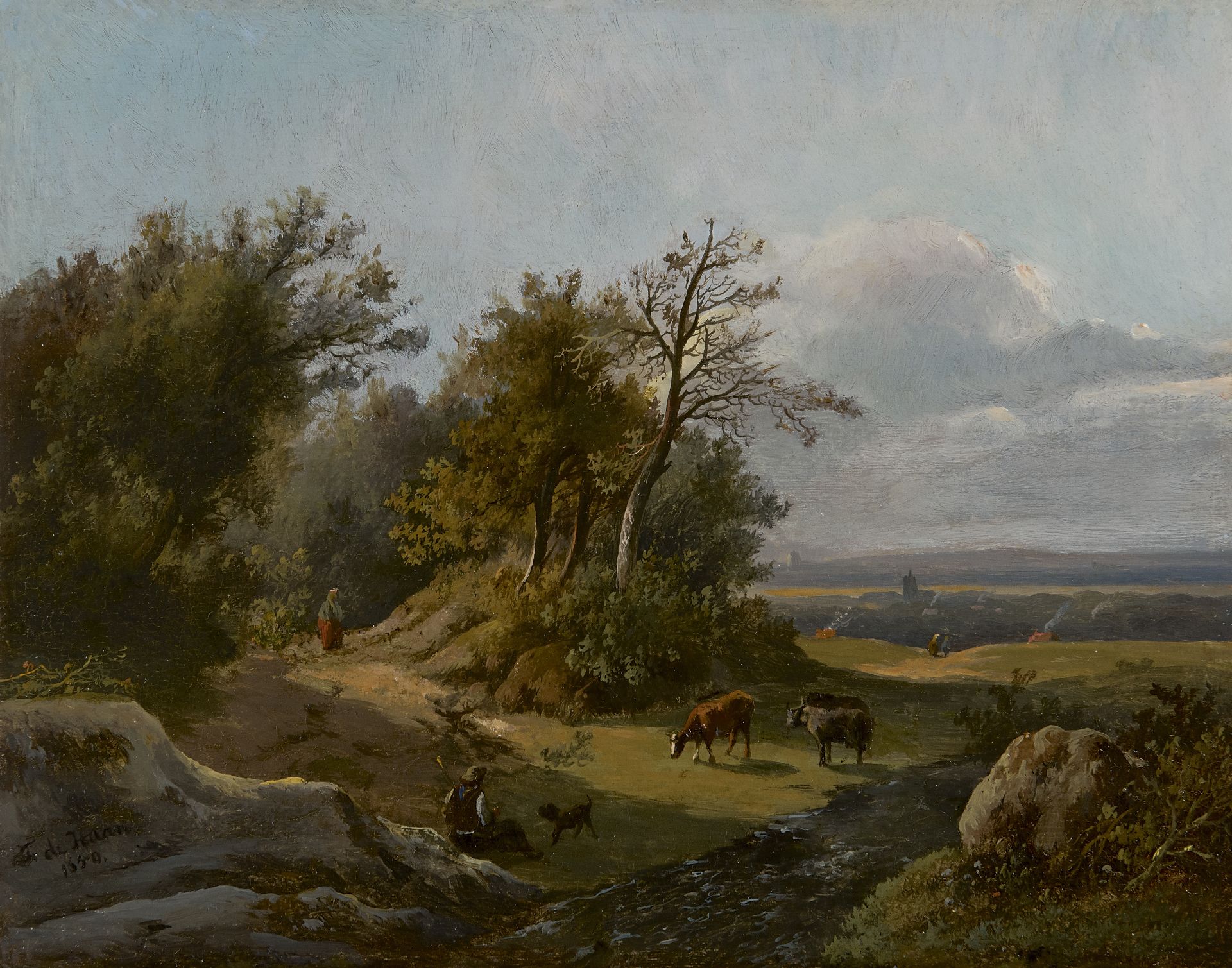 Franciscus Antonius de Haan kunstwerk • schilderij • voorheen te koop Herder met vee in zonnig heuvellandschap