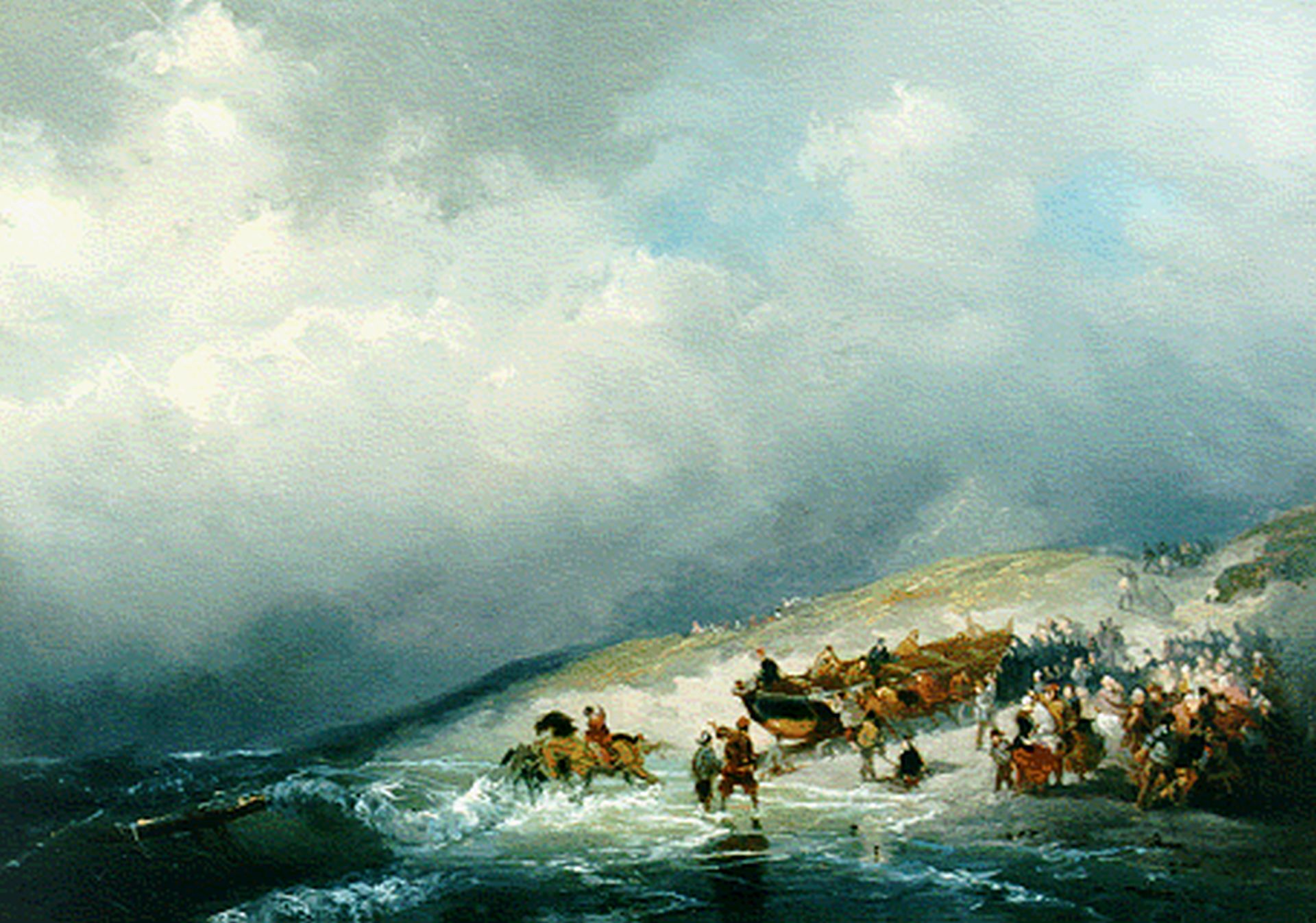 Frans Arnold Breuhaus de Groot kunstwerk • schilderij • voorheen te koop Paarden trekken de reddingsboot in het water
