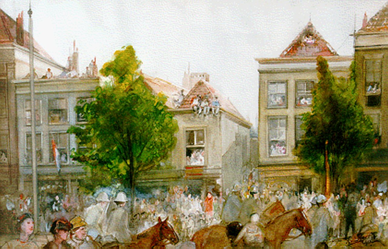 Frans Bakker kunstwerk • aquarel • tekening • voorheen te koop Optocht t.e.v. uitvaart Prins Hendrik op 't Spui in Den Haag