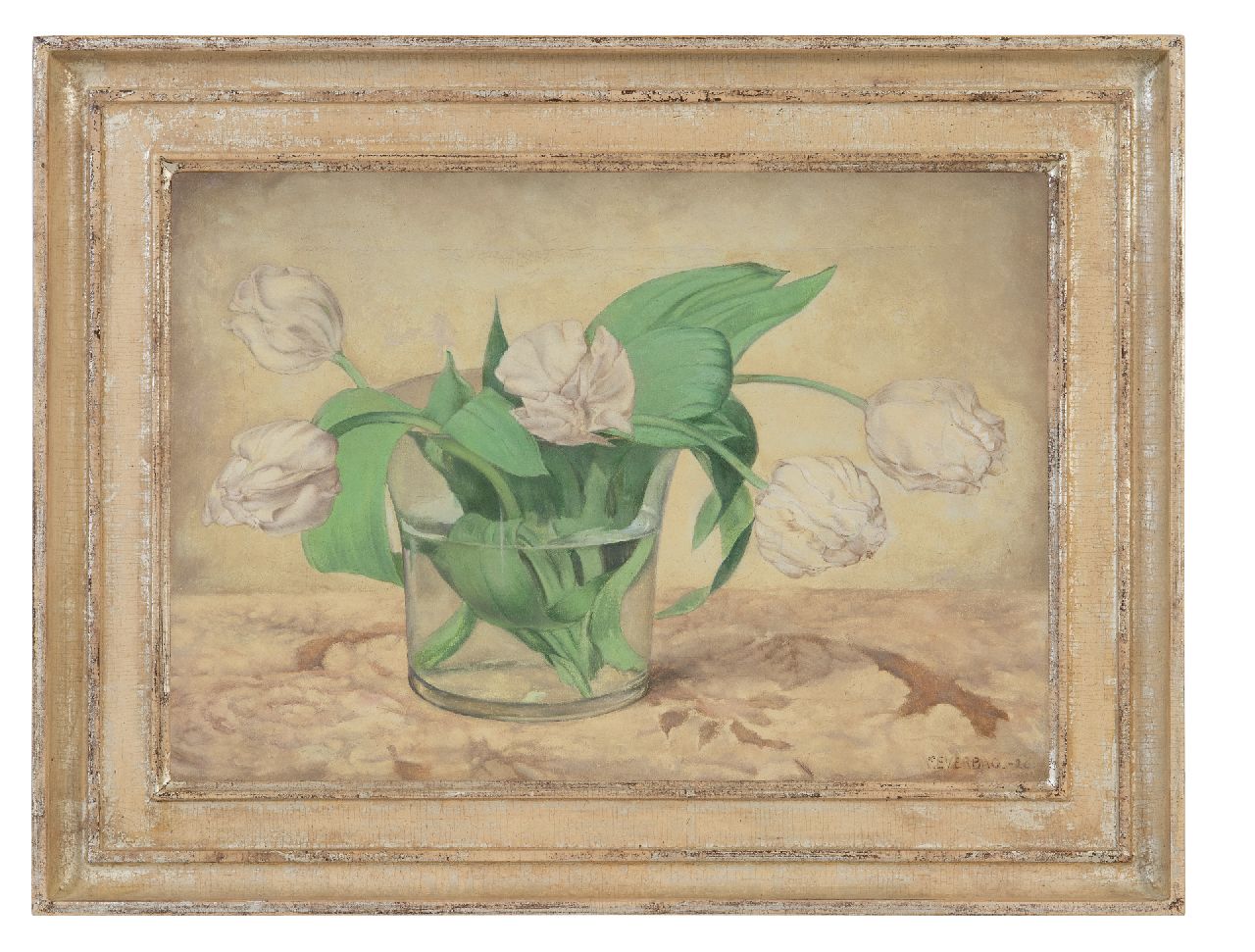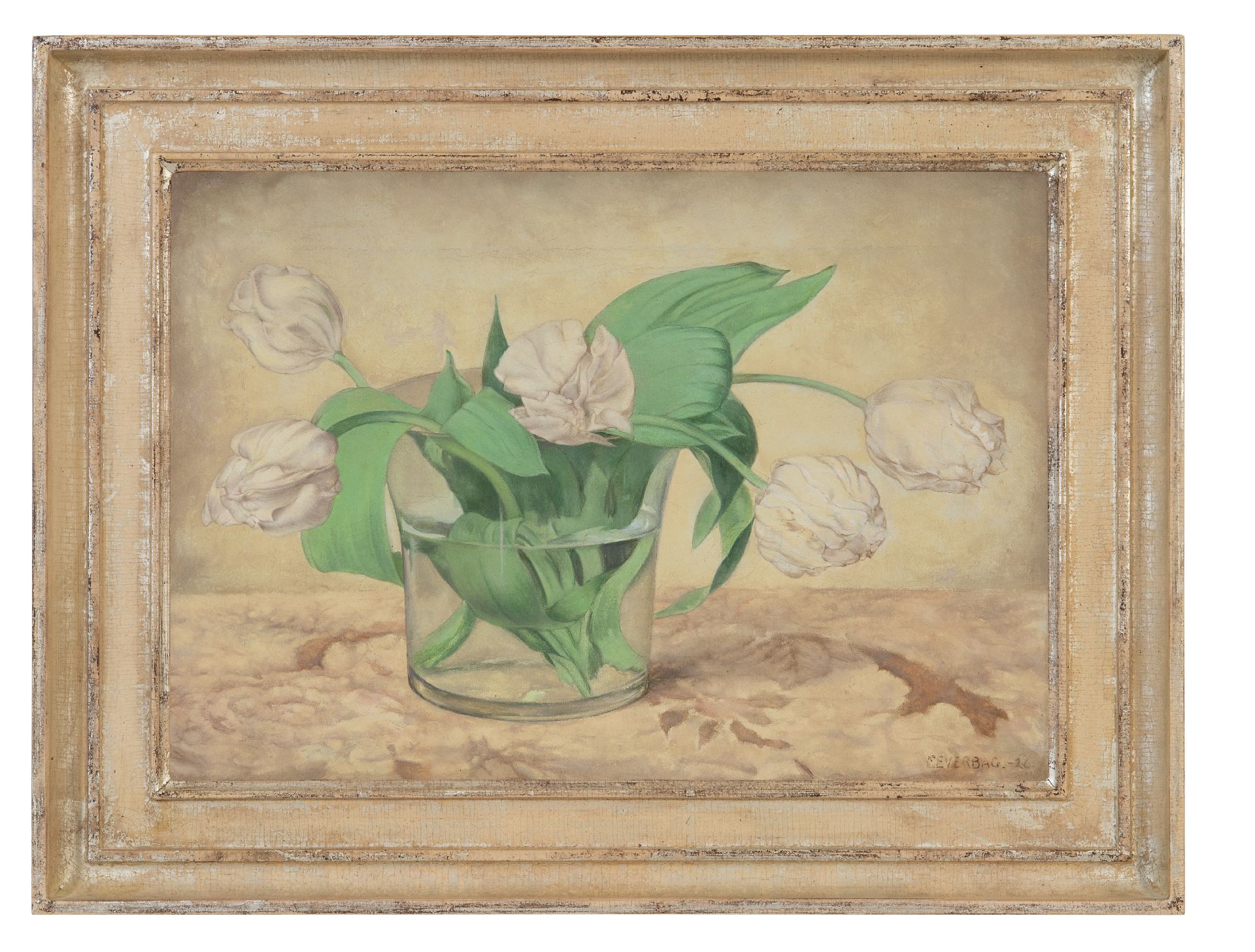 Frans Everbag kunstwerk • schilderij • voorheen te koop Witte tulpen in glazen vaas