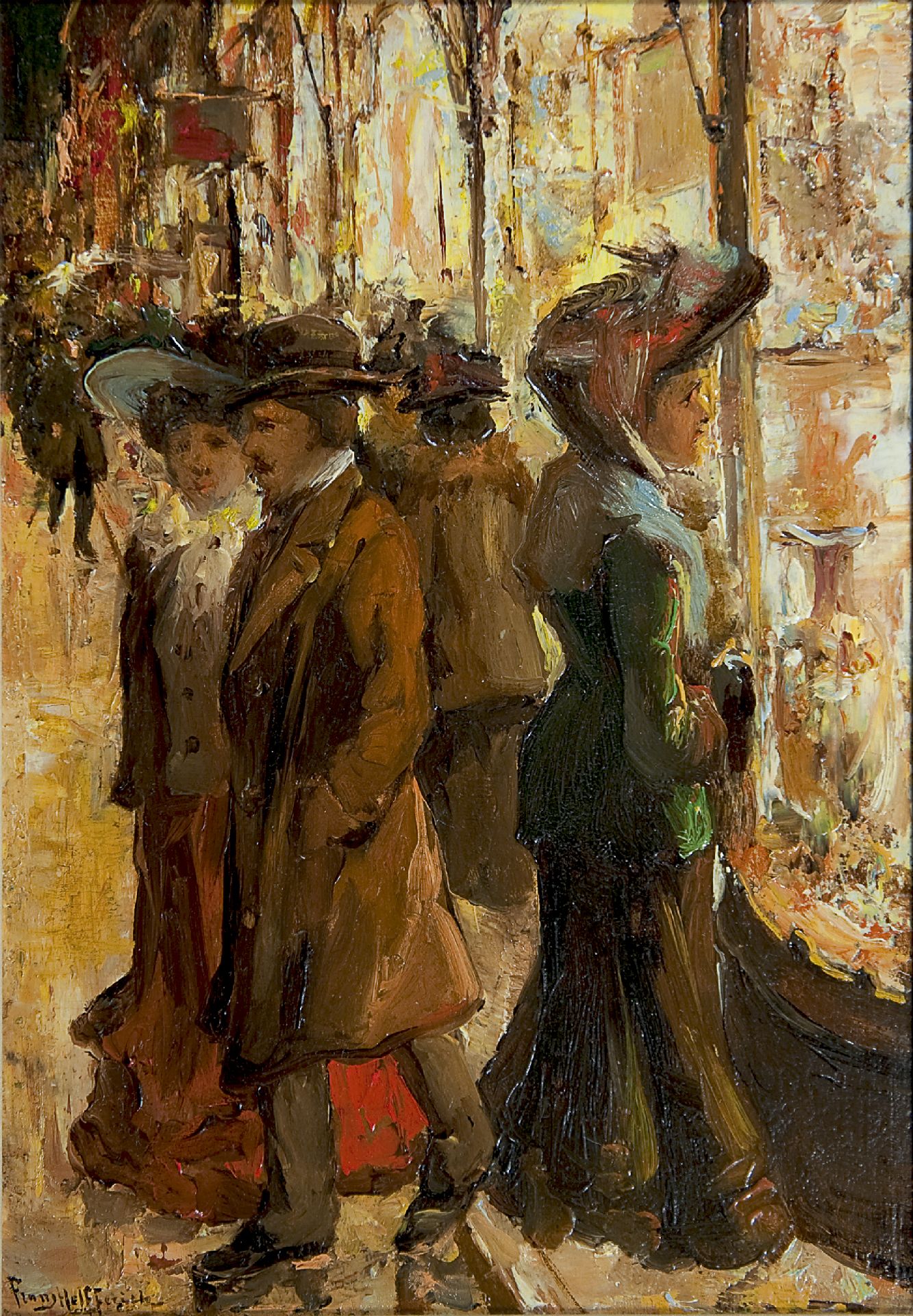 De impressionist Frans Helfferich woonde en werkte het grootste deel van zijn leven in Den Haag. Daar volgde hij een opleiding aan de Haagse akademie en ontwikkelde hij zich tot een schilder van landschappen in de trant van de Haagse School. Opvallend zijn de vlot-impressionistische voorstellingen van het moderne stadsleven in de hofstad, veel 'frivoler' en anders van sfeer dan de stadsportretten van zijn zes jaar oudere stadgenoot Floris Arntzenius. In veel van de winkelstraten die hij schilderde speelt het electrische licht van de etalages, dat rond 1900 zijn intrede deed, een belangrijke rol. Het stond voor het moderne leven en straalde welvaart en luxe uit.