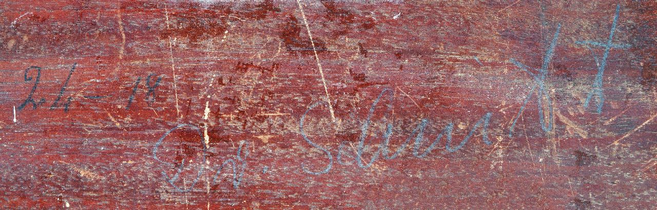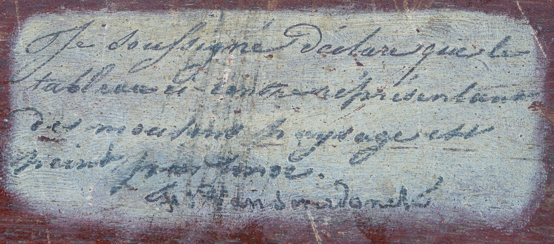 annotatie met verso authenticiteitsverklaring van de schilder: 'le sousigné déclare que le tableau ci-contre représentant des moutons en paysage est peint par Monsr. F. Van Severdonck'